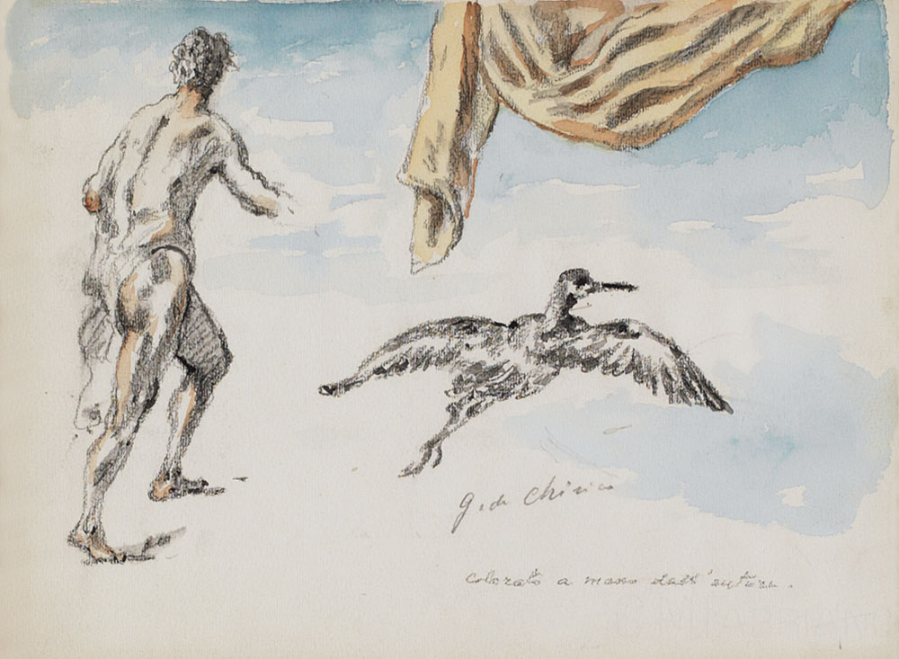 tempera e acquerello su carta cm. 23,5x31,5; firma e dicitura "colorata a mano dall'autore" in basso a destra, timbri della Galleria Iolas (MI) al retro, opera registrata presso l'Archivio della Fondazione Giorgio e Isa De Chirico a cura del Prof. Paolo Picozza su foto.