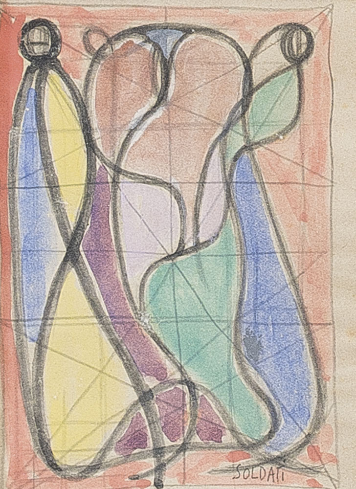 acquerello e matita su carta cm. 16,7x9,8; firma in basso a destra, timbro "Opere inventariate di Atanasio Soldati" in basso a destra, timbri ed etichetta della Galleria Lagorio Arte Contemporanea (BS) al retro, opera registrata presso l'Archivio Atanasio Soldati come da dichiarazione su foto con timbri e firma di Augusto Garau.