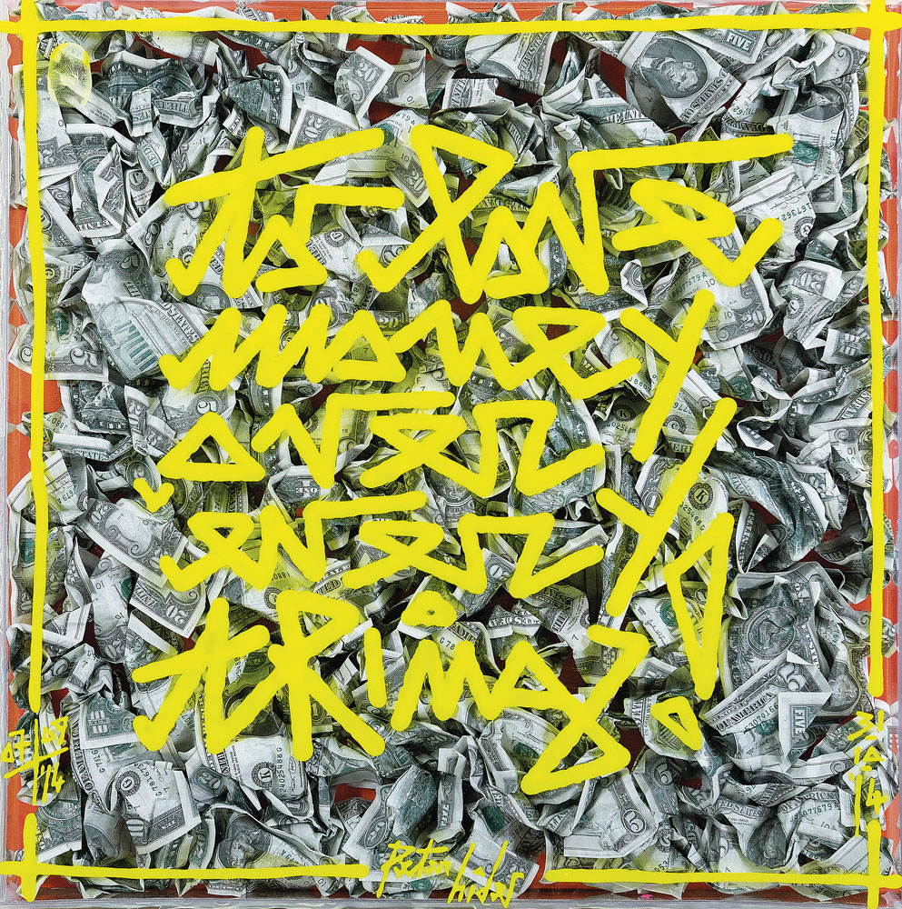 tecnica mista e banconote (fac-simile) su tela con teca a copertura in plexiglass dipinto cm. 50x50x5, firma in basso al centro, anno in basso a destra e a sinistra, titolo, firma, anno, timbri ed etichette dell'artista al retro, dichiarazione d'autenticità dell'artista su certificato allegato.