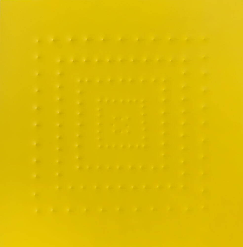 n° 144 spari di pistola cal. 5,56 su lastra in alluminio (colore giallo) montata su telaio in legno cm. 100x100x5, firma e tecnica al retro, dichiarazione d'autenticità dell'artista su foto, opera priva di cornice.