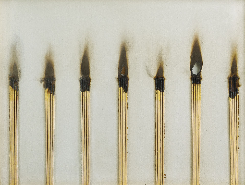fiammiferi bruciati su cartone cm. 50x65, firma dell'artista su etichetta Galleria Centro (BS) al retro, dichiarazione d'autenticità della Gio Arte (Mestre) su foto.