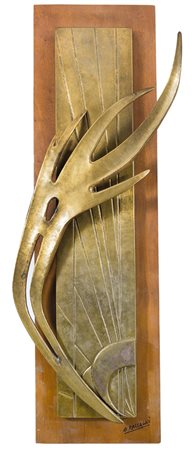 scultura da parete in bronzo cm. 102x44x20 applicata su legno cm. 115x32,5x5, firma in basso a destra sul legno.