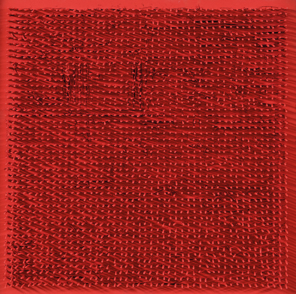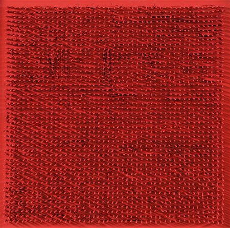 acrilici e chiodi su tavola cm. 50x50, firma e anno al retro, dichiarazione d'autenticità dell'artista e timbro a secco dell'Archivio Aubertin su foto.