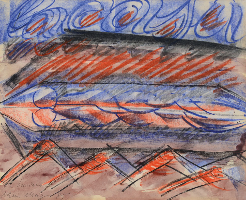 tecnica mista su carta cm. 33x41, firma, anno e dedica dell'artista ad personam in basso a sinistra, opera registrata presso l'Archivio Mario Merz al n° 1903/1985/CT come da dichiarazione su foto.