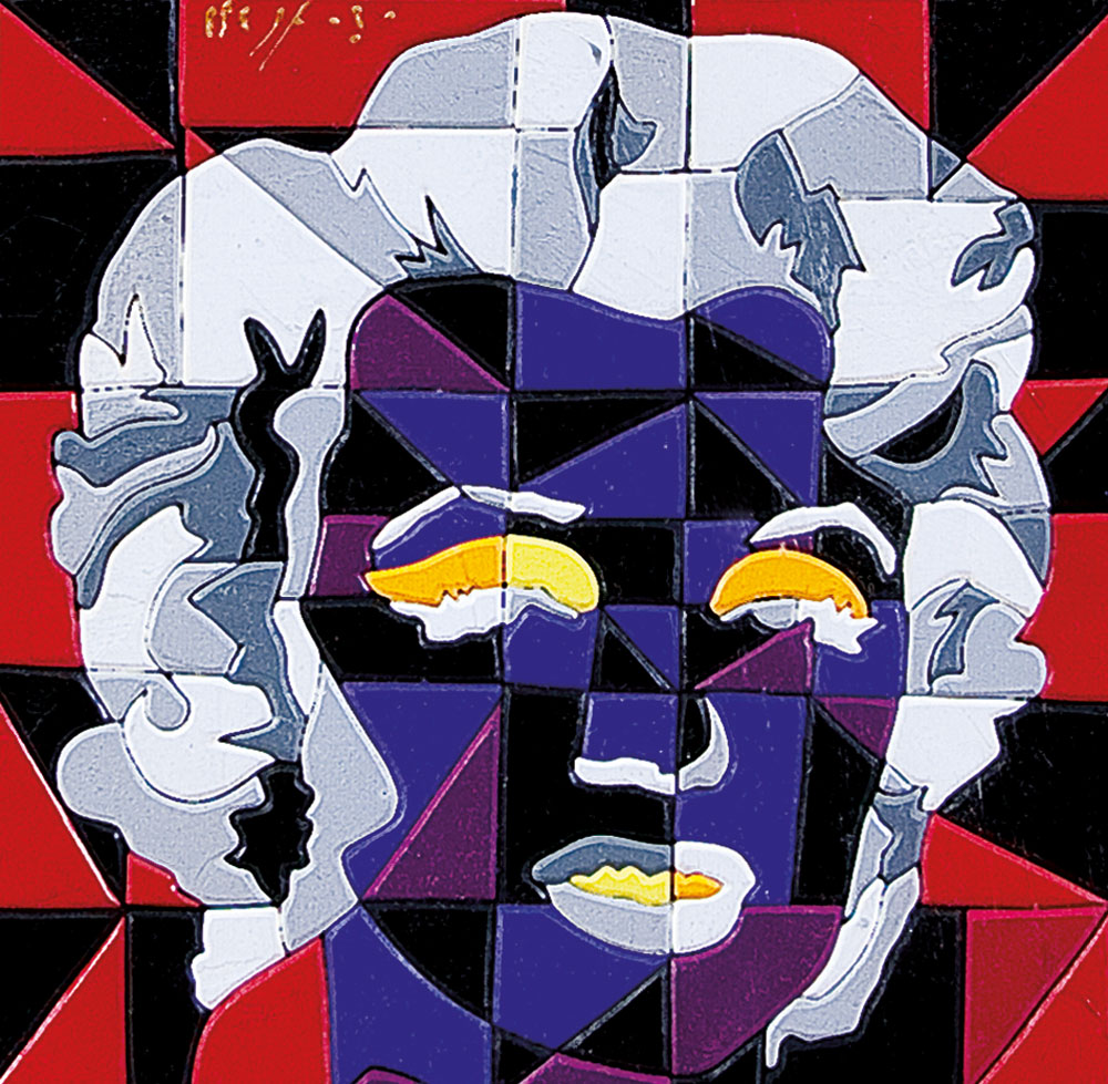 acrilici e intarsio su legno cm. 24x24, firma in alto a sinistra, titolo, tecnica, timbro ed etichetta dell'artista al retro, dichiarazione d'autenticità ed etichette dell'artista su foto, entro teca in plexiglass.
