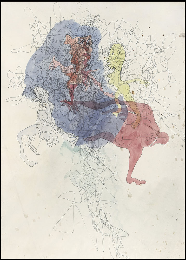 inchiostro e acquerello su carta applicata su tela cm. 70x50, opera non firmata, etichetta e timbro della Galleria d'Arte L'Elefante (TV) al retro.