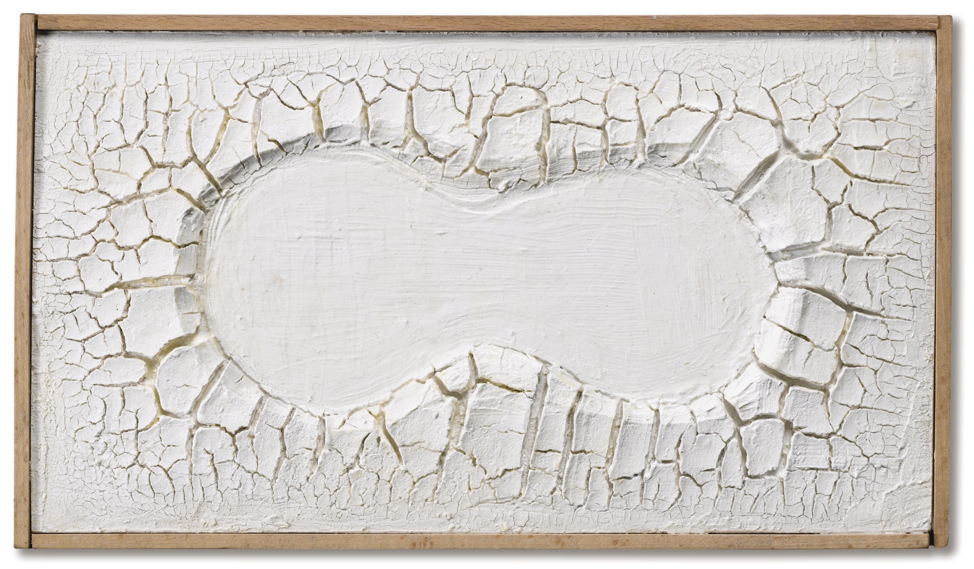 Alberto Burri 1915 - 1995 BIANCO CRETTO SIGNED ON REVERSE, ACROVINYL ON BOARD. EXECUTED IN 1972 firmato sul retro acrovinilico su tavola cm 16,5x29 (con cornice originale) Eseguito nel 1972 READ CONDITION REPORT AUTHENTICATION Opera registrata presso la Fondazione Palazzo Albizzini, Città di Castello, con il n. 7231 L'opera è accompagnata da certificato rilasciato dalla Fondazione Albizzini, Città di Castello PROVENANCE Acquisito dalla famiglia dell'attuale proprietario direttamente dall'artista negli anni Settanta