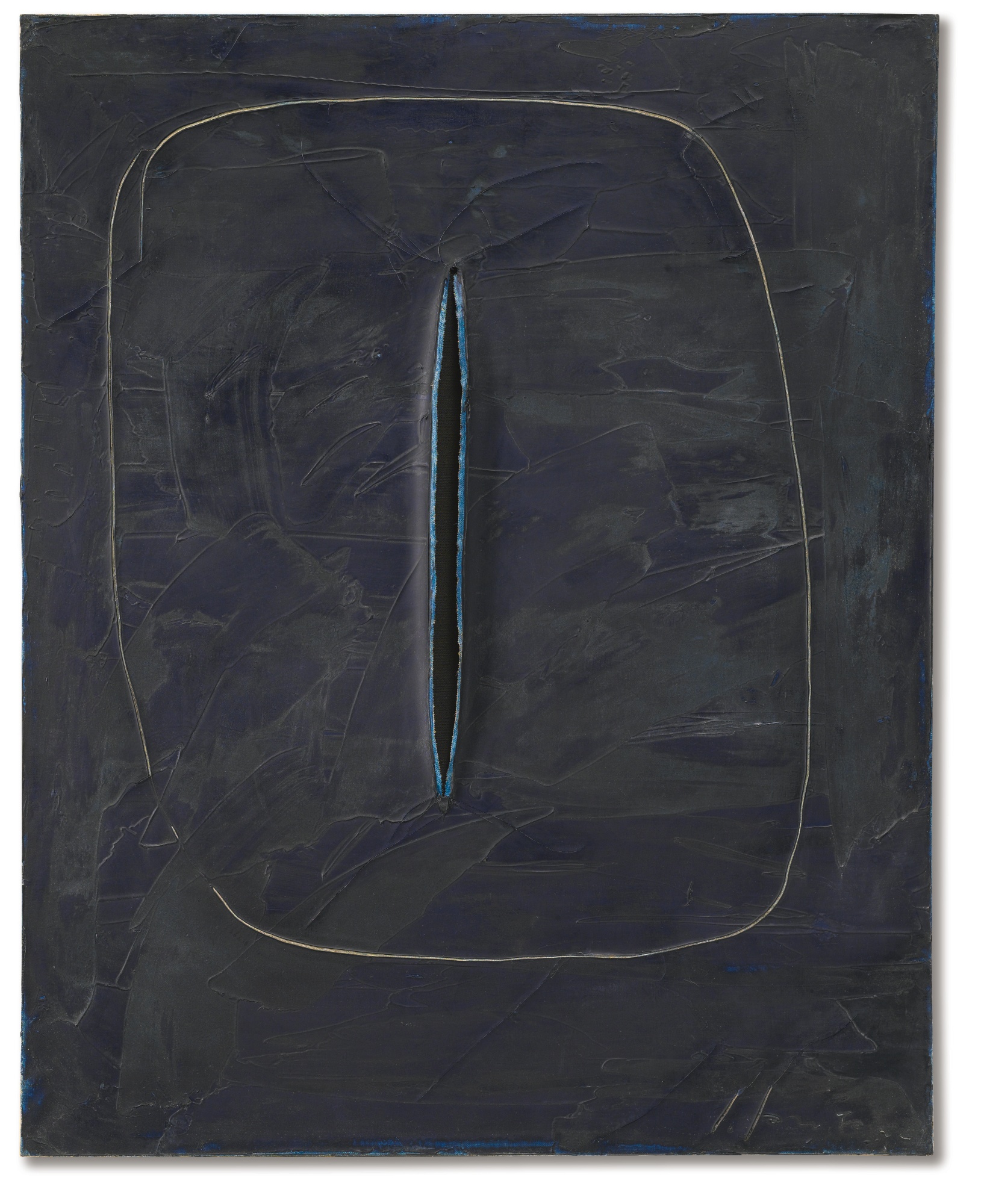 Lucio Fontana 1899 - 1968 CONCETTO SPAZIALE, ATTESA SIGNED, SIGNED, TITLED AND INSCRIBED ON THE REVERSE, OIL, GRAFFITO AND CUT ON CANVAS. EXECUTED IN 1961 firmato; firmato, intitolato e iscritto 1 + 1 – 3A3A sul retro olio, graffiti e taglio su tela cm 81x65 Eseguito nel 1961 READ CONDITION REPORT SALEROOM NOTICE PROVENANCE Collezione privata Europa, Perugia Collezione Manzoni-de-Franchis, Genova, Verona Collezione Enzo Quaratino, Verona Ivi acquistato dall'attuale proprietario LITERATURE Enrico Crispolti, Lucio Fontana – Catalogue raisonné, Bruxelles 1974, vol. II, pp. 108-109 illustrato Enrico Crispolti, Lucio Fontana – Catalogo generale, Milano 1986, vol. I, p. 364 illustrato Enrico Crispolti, Lucio Fontana - Catalogo ragionato di sculture, dipinti, ambientazioni, Milano 2006, vol. II, p. 548, n. 61 O 17, illustrato
