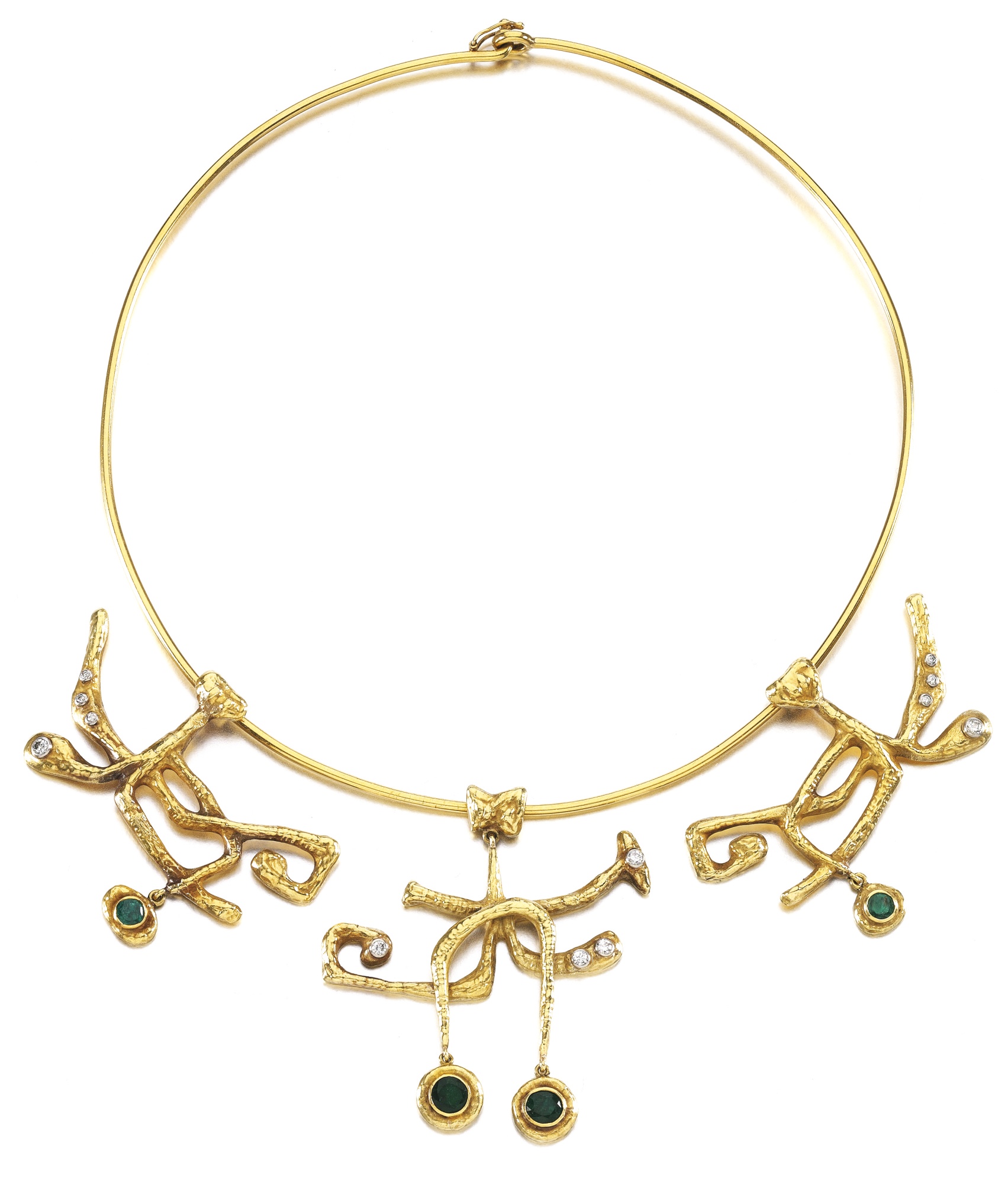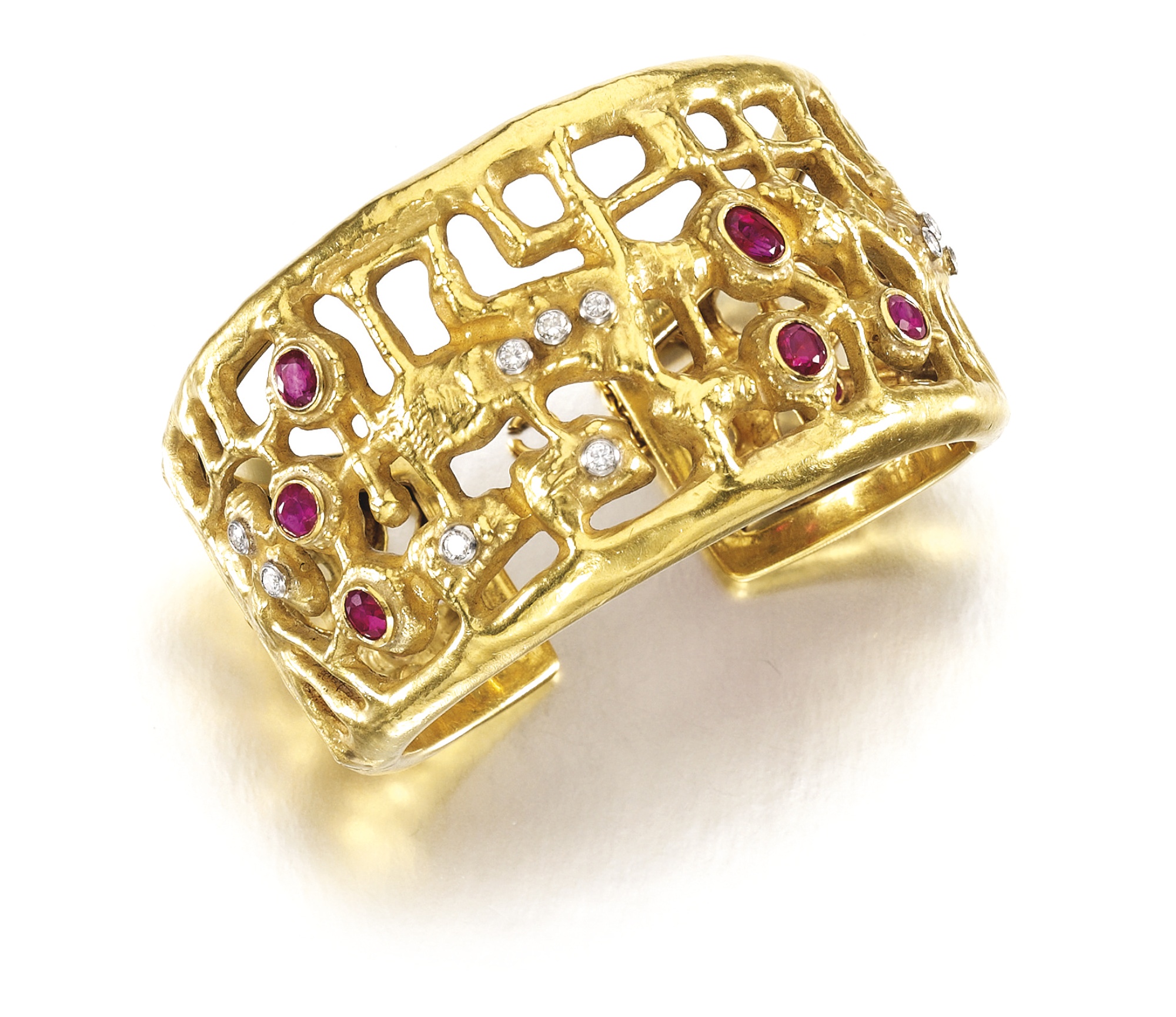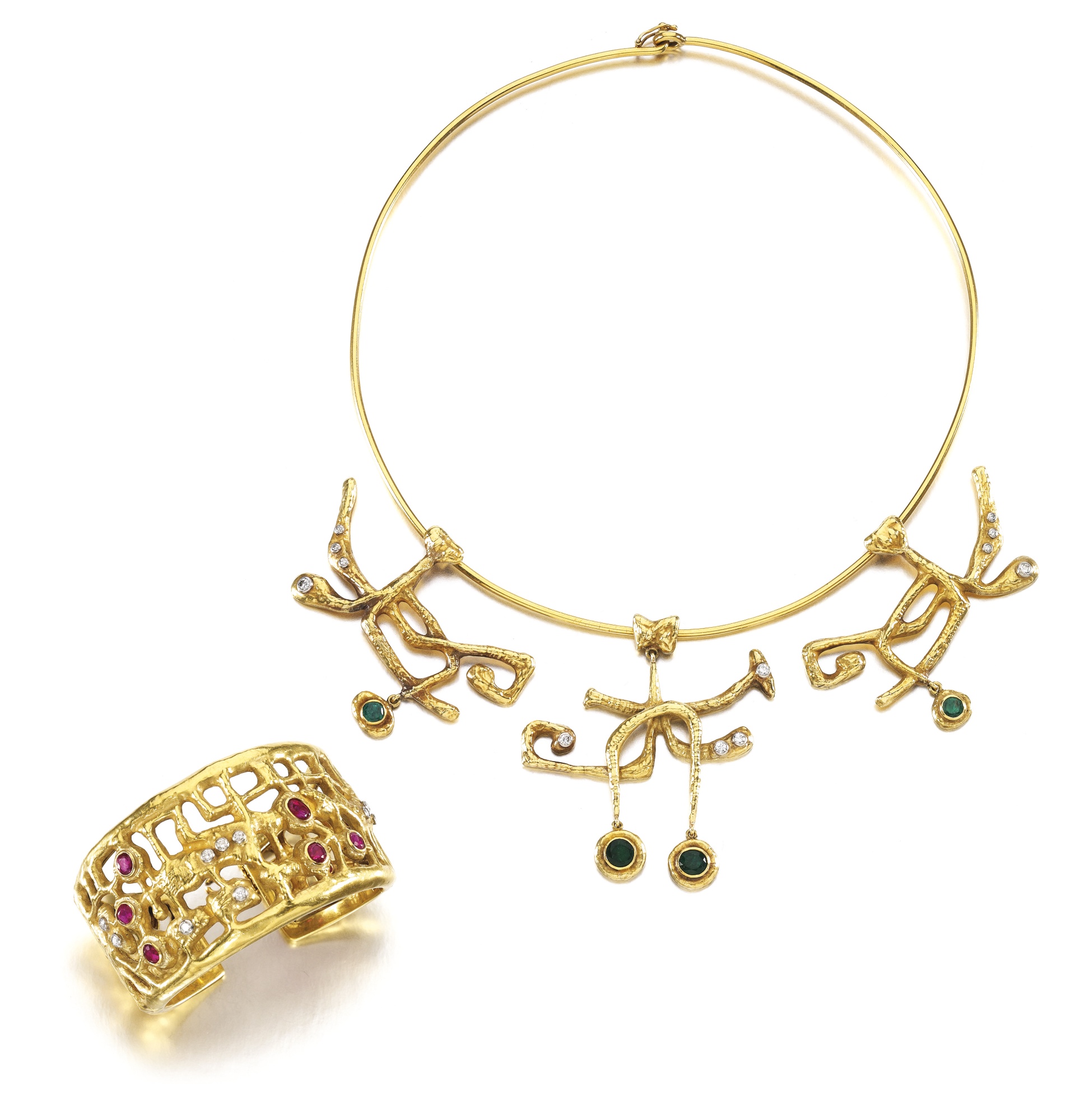 Afro 1912 - 1976 BRACCIALE BOTH SIGNED 'AFRO', 'MASENZA, ROMA', GOLD BRACELET WITH 10 DIAMONDS AND 10 RUBIES AND GOLD COLLIER WITH 12 DIAMONDS AND 4 EMERALDS. EXECUTED IN 1960 CIRCA (2) firmato internamente Afro, Masenza Roma bracciale in oro, decorato con diamanti taglio brillante, rubini di taglio circolare ed ovale, esemplare realizzato da Masenza su disegno di Afro altezza cm 4,2; dimensioni cm 6,5x5,3 Eseguito nel 1960 circa READ CONDITION REPORT SALEROOM NOTICE AUTHENTICATION Opera registrata presso l'Archivio Afro, Roma L'opera è accompagnata da certificato su fotografia rilasciato dall'Archivio Afro, Roma