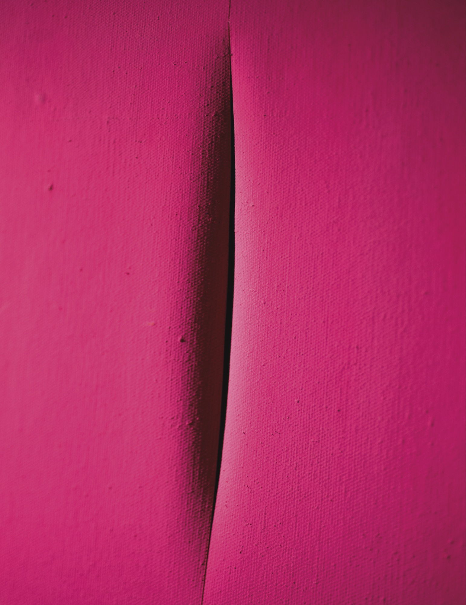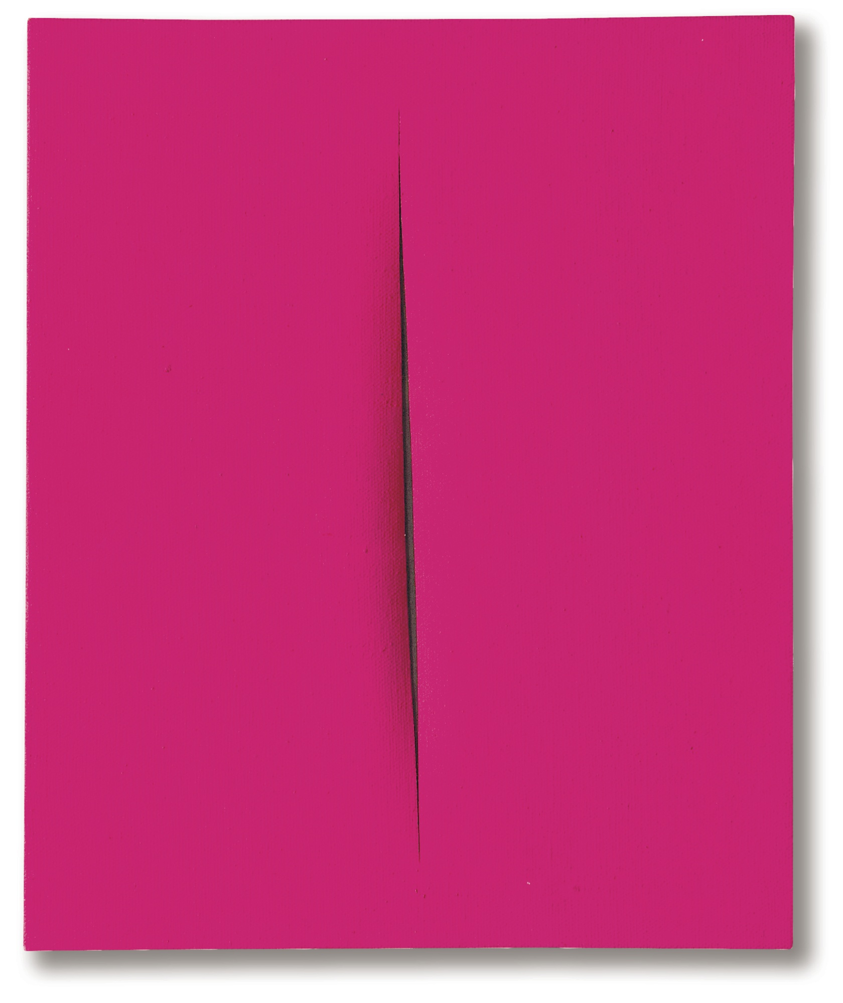 Lucio Fontana 1899 - 1968 CONCETTO SPAZIALE, ATTESA SIGNED, TITLED, DEDICATED AND INSCRIBED ON THE REVERSE, WATERPAINT ON CANVAS. EXECUTED IN 1964 firmato, intitolato, dedicato e iscritto sul retro: l.fontana/”Concetto Spaziale/ATTESA/Pour Pierre/l.fontana/che bel colorino/mi piace… idropittura su tela cm 46x38 Eseguito nel 1964 READ CONDITION REPORT PROVENANCE Galerie Pierre AB, Stoccolma (regalo dell'artista) Studio Marconi, Milano Ivi acquistato dal padre dell'attuale proprietario nel 1977 LITERATURE Enrico Crispolti, Lucio Fontana. Catalogue Raisonné, Bruxelles 1974, vol. II, pp. 154 e 155, illustrato Enrico Crispolti, Lucio Fontana. Catalogo generale, Milano 1986, vol. II, p. 526, illustrato Enrico Crispolti, Lucio Fontana. Catalogo ragionato di sculture, dipinti, ambientazioni, Milano 2006, vol. II, p. 716, n. 64 T 61, illustrato