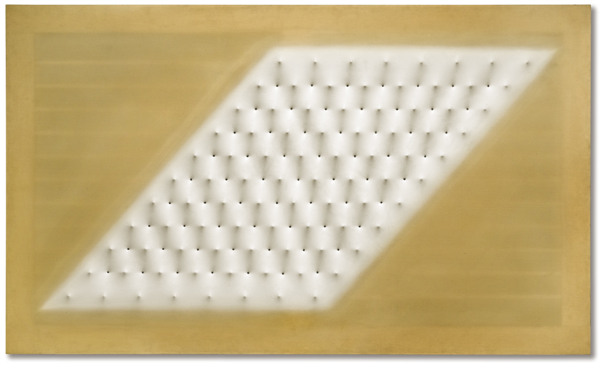 Enrico Castellani N. 1930 SUPERFICIE SIGNED, TITLED AND DATED 73 ON THE STRETCHER, ACRYLIC AND POLYESTER RESIN ON CANVAS firmato, intitolato e datato 73 sul telaio acrilico e resina poliestere su tela cm 120x200 READ CONDITION REPORT AUTHENTICATION Opera registrata presso l'Archivio Enrico Castellani, Milano, con il n. 73-019 PROVENANCE Galleria dell'Ariete, Milano Collezione privata, Avellino Ivi acquistato dall'attuale proprietario all'inizio degli anni 2000 EXHIBITED Roma, Galleria Arco d'Alibert, Enrico Castellani, 1985, illustrato sull'invito LITERATURE Renata Wirz con Federico Sardella, Enrico Castellani Catalogo ragionato Opere 1955-2005, tomo II, Milano 2012, n. 367, p. 416, illustrato
