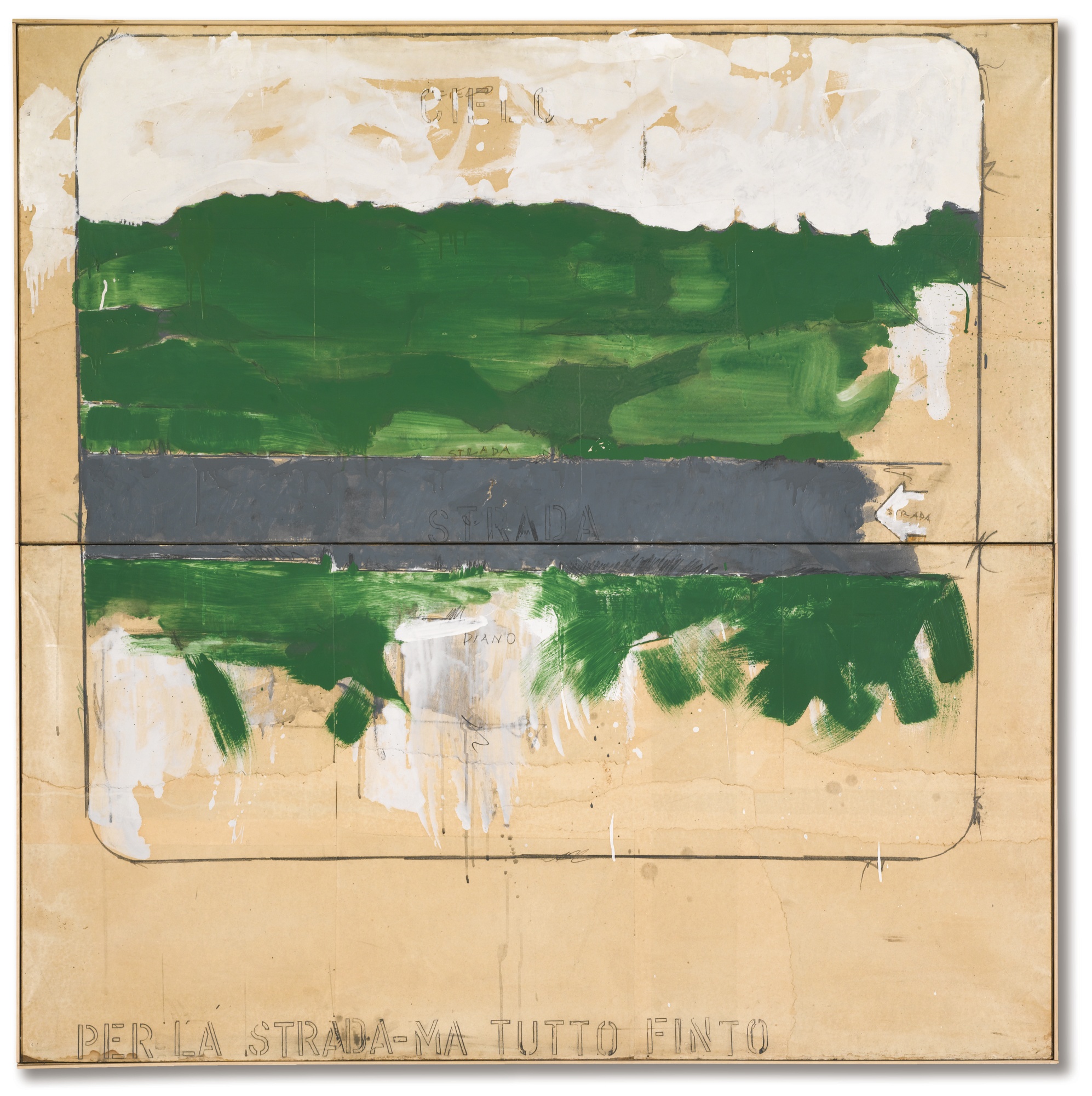 Mario Schifano 1934 - 1998 PER LA STRADA-MA TUTTO FINTO INSCRIBED AND TITLED, CHARCOAL AND ENAMEL ON PAPER LAID ON CANVAS. EXECUTED IN 1963 iscritto e intitolato carboncino e smalto su carta da pacco applicata su tela cm 160x160 (in due parti) Eseguito nel 1963 READ CONDITION REPORT AUTHENTICATION Opera registrata presso l'Archivio Mario Schifano, Roma, con il n.02854150214 Opera accompagnata da certificato su fotografia rilasciato dall'Archivio Mario Schifano, Roma PROVENANCE Collezione M. Maggi/Raimondi, Roma Ivi acquistato dall'attuale proprietario EXHIBITED Mosca, Casa Centrale dell'Artista; Leningrado, Sala Centrale delle Esposizioni, Orientamenti dell'Arte Italiana, Roma 1947-89, 1989, p. 111, illustrato Milano, Fondazione Marconi, Schifano 1960-1964. Dal monocromo alla strada, 2005, p. 175, illustrato LITERATURE Marco Goldin, Achille Bonito Oliva, Mario Schifano, Opere 1957-1997, Milano 1998, p. 75, illustrato CATALOGUE NOTE L'attestato di libera circolazione è stato richiesto per questo lotto An export licence has been requested for this lot Come per i celebri Paesaggi anemici, Schifano, nell' eseguire Per la strada ma tutto finto, ha utilizzato colori a smalto su fogli di carta da pacco incollati su tela. La composizione è qui stabilita da una struttura rettangolare ad angoli smussati che evoca la cornice assente e che stabilisce analogie con il telaio di una diapositiva o con lo schermo di un televisore: la televisione è la nostra finestra sul mondo come un tempo è stata la pittura e in passato prossimo la fotografia. Come si può notare dalla struttura dell’opera, l’artista ha riprodotto all’interno del riquadro della composizione una campagna tagliata da una strada - o forse proprio da un’autostrada - dimostrando di essere consapevole della propria contemporaneità. Si noti, infatti, che quest'opera è databile nei primi anni Sessanta, periodo in cui ebbe termine la realizzazione dell’Autostrada del Sole, importante opera pubblica volta a rilanciare l’economia italiana nel secondo dopoguerra. Negli anni che seguono, l’attenzione nei confronti della televisione aumenterà notevolmente tramutandosi in una sorta di ossessione artistica dell’artista. Schifano in executing Per la strada ma tutto finto (on the road but everything is not real) uses enamels on wrapping paper laid on canvas, same technique he used for the well known 'Paesaggi Anemici' (anemic landscapes) In this case the composition is created by " a rectangular structure with rounded angles that evokes a missing frame, and presents analogies with the stretcher of a photographic slide or the screen of a television: the television perceived as our window overlooking the world as in the past was the art of painting and in an upcoming future will be photography". As one can easily notice the this work's composition focuses on a countryside cut by a motorway or most probably a highway, which underlies the artist's contemporaneity. As a matter of fact the work was executed in the first half of the Sixties when the Italian Autostrada del Sole, one of the most important public services realized after the Second World War was ended. In the following years the attention Schifano pays to television an increasing attention that turns it into one of his artistic obsessions.
