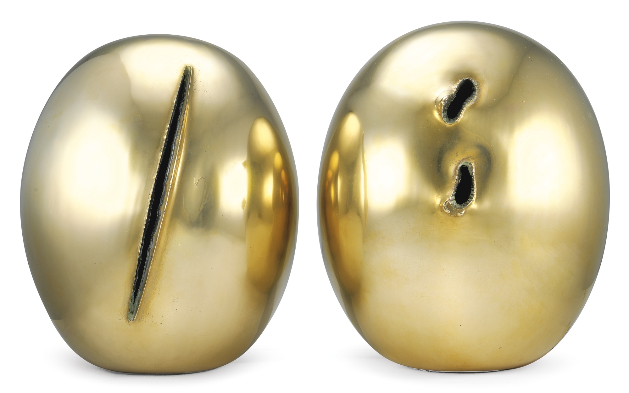 Lucio Fontana 1899 - 1968 CONCETTO SPAZIALE SIGNED AND NUMBERED 26/500, POLISHED BRASS. EXECUTED IN 1967 IN EDITION OF 500 + 5 P.A. firmati e numerati 26/500 ottone lucidato, due elementi cm 27x22x22 ciascuno Eseguito nel 1967 in 500 esemplari + 5 p.A.