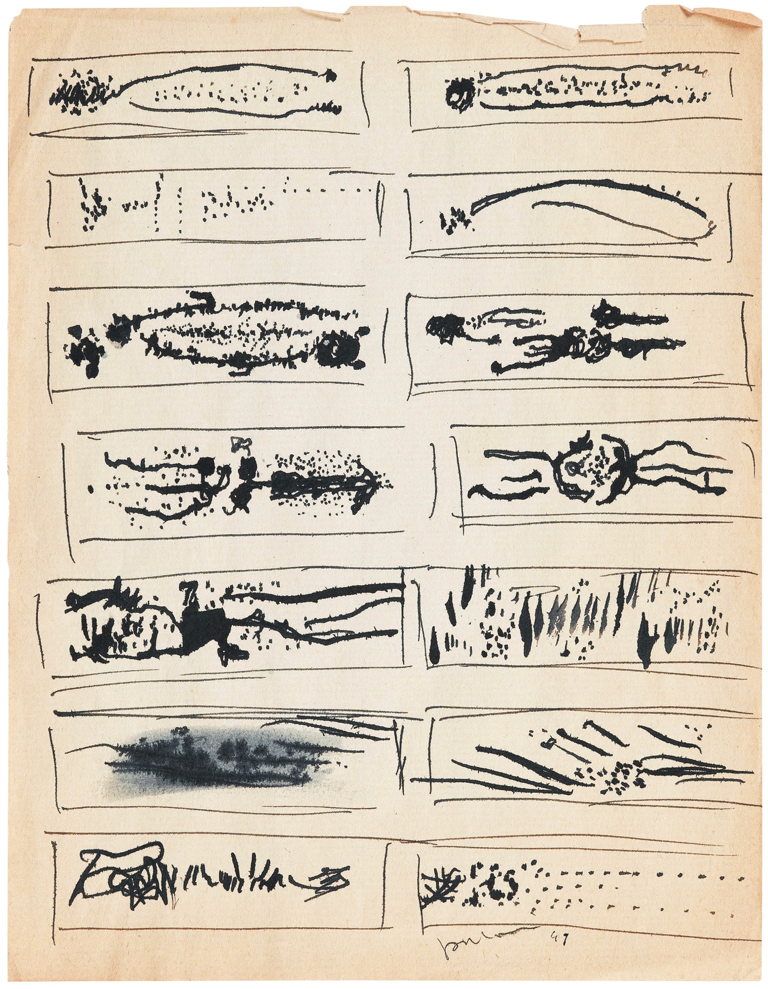 Lucio Fontana 1899 - 1968 STUDIO PER DECORAZIONE ARCHITETTONICA INK ON PAPER. EXECUTED IN 1952 china su carta cm 28x22 Eseguito nel 1952 READ CONDITION REPORT AUTHENTICATION Opera registrata presso la Fondazione Lucio Fontana, Milano, con il n. 1900/258 L'opera è accompagnata da certificato su fotografia rilasciata dalla Fondazione Lucio Fontana, Milano CATALOGUE NOTE Studio per rilievi dell'edificio di Via Lanzone 6 a Milano