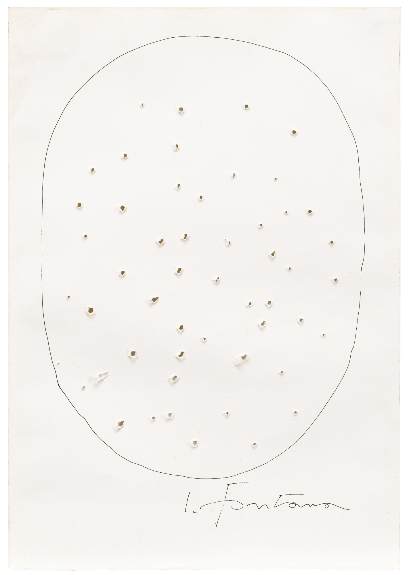 Lucio Fontana 1899 - 1968 SENZA TITOLO SIGNED, BLACK INK AND HOLES ON PAPER. EXECUTED IN 1966-1968 firmato china nera e buchi su carta cm 50x35 Eseguito nel 1966-1968 READ CONDITION REPORT AUTHENTICATION Opera registrata presso la Fondazione Lucio Fontana, Milano, con il n. 1545/1 L'opera è accompagnata da certificato su fotografia rilasciato dalla Fondazione Lucio Fontana, Milano