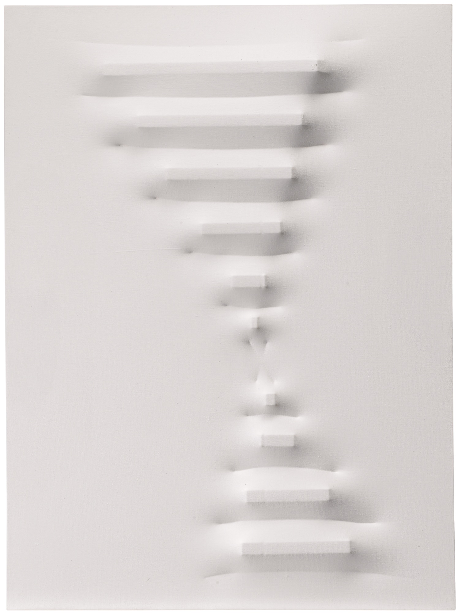 Agostino Bonalumi 1935 - 2013 BIANCO SIGNED AND DATED 73 ON THE REVERSE, SHAPED CANVAS AND VYNIL TEMPERA firmato e datato 73 sul retro tela estroflessa e tempera vinilica cm 80x60 READ CONDITION REPORT AUTHENTICATION Opera registrata presso l'Archivio Agostino Bonalumi, Milano, con il n. 73-044 L'opera è accompagnata da certificato su fotografia rilasciato dall'Archivio Agostino Bonalumi, Milano PROVENANCE Galleria F22, Palazzolo Sull'Oglio Ivi acquistato dalla famiglia dell'attuale proprietario