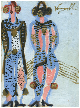 ANTONIO VANGELLI Roma 1917 – Roma 2004 Ragazzi del circo 1978 Olio, porporina e tec. mista su tela 24 x 18. Firma in a. a d.; sul verso titolo, data e firma + scritta parzialmente leggibile di una galleria. B.A.: 200