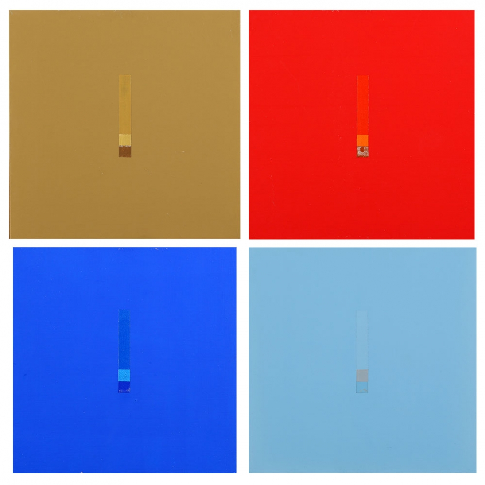 JORRIT TORNQUIST 1938 I 4 elementi, Opus 700 Terra, Opus 701 Fuoco, Opus 702 Acqua, Opus 703 Aria, 1975 Acrilico su tavola, cm. 20 x 20 (cadauno) Firmato e datato sul retro Autentica dell’artista su fotografia Prov. Collezione Privata