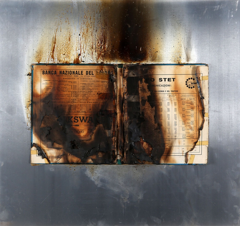 BERNARD AUBERTIN 1934 Livre Brulé, 1974 Libro bruciato applicato su lamiera, cm. 66 x 70 Firmato e datato sul retro Etichetta Galleria Centro Brescia sul retro Autentica dell’artista su fotografia Opera registrata presso l’Archivio Bernard Aubertin Prov. Collezione Privata