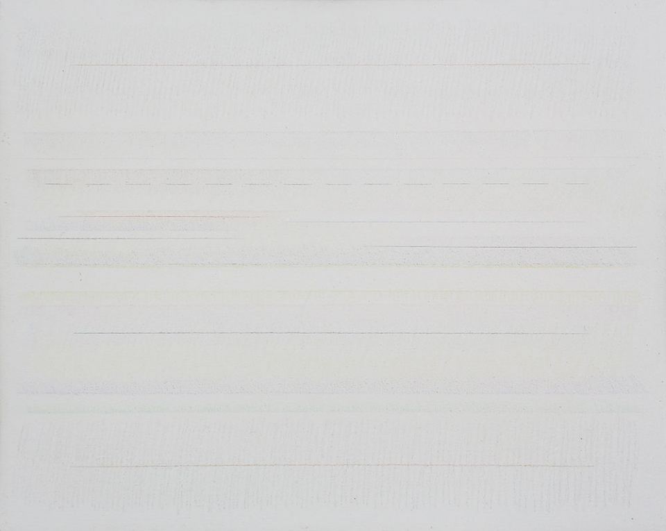 RICCARDO GUARNERI 1933 Due strisce con intervalli, 1975 Tecnica mista su tela, cm. 40 x 50 Firmato e datato sul retro Timbro Galleria Method Bergamo sul retro Certificato di provenienza Galleria Poleschi Prov. Collezione Privata
