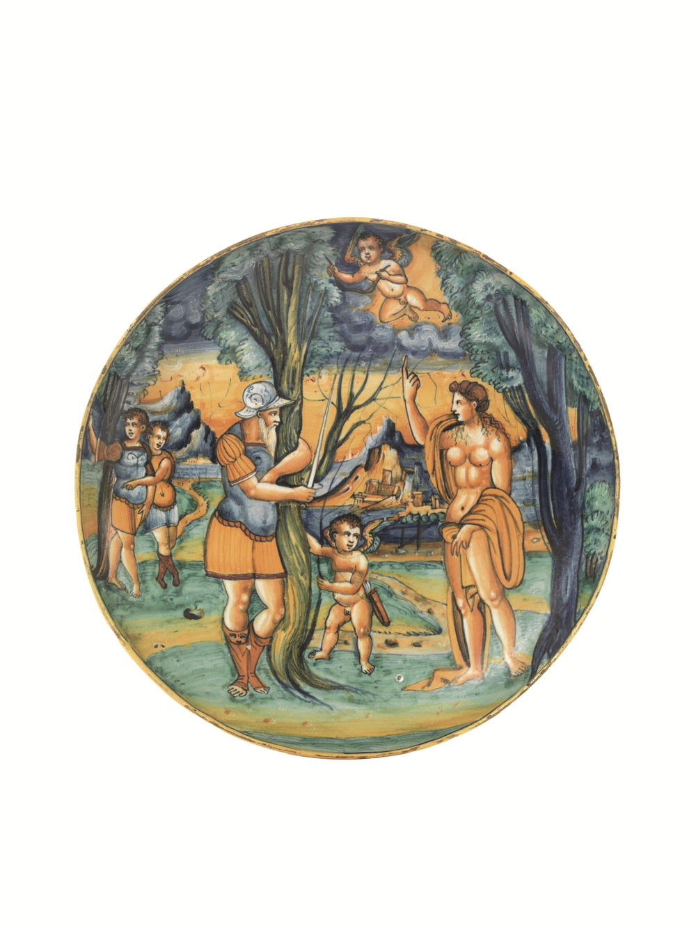 La rappresentazione si adatta alla forma del manufatto, assecondandone le curve e le convessità e raffigura un soggetto mitologico ambientato in un paesaggio racchiuso da alberi e quinte di montagne sullo sfondo. Una città turrita si confonde nel paesaggio tra montagne, prati ondeggianti e fiumi. I due protagonisti della scena, Marte e Venere, si affrontano al centro del piatto: Marte appoggiato a un albero, ai cui piedi si scorge Cupido intento a guardare la madre, ritta sulla destra del piatto con la mano alzata ad indicare il cielo dove un amorino appare reggendo nelle mani un arco, probabilmente destinato a Cupido, già armato di faretra. Poco distante due personaggi, intenti a dialogare, sembrano avvicinarsi alla radura in cui si svolge la vicenda.