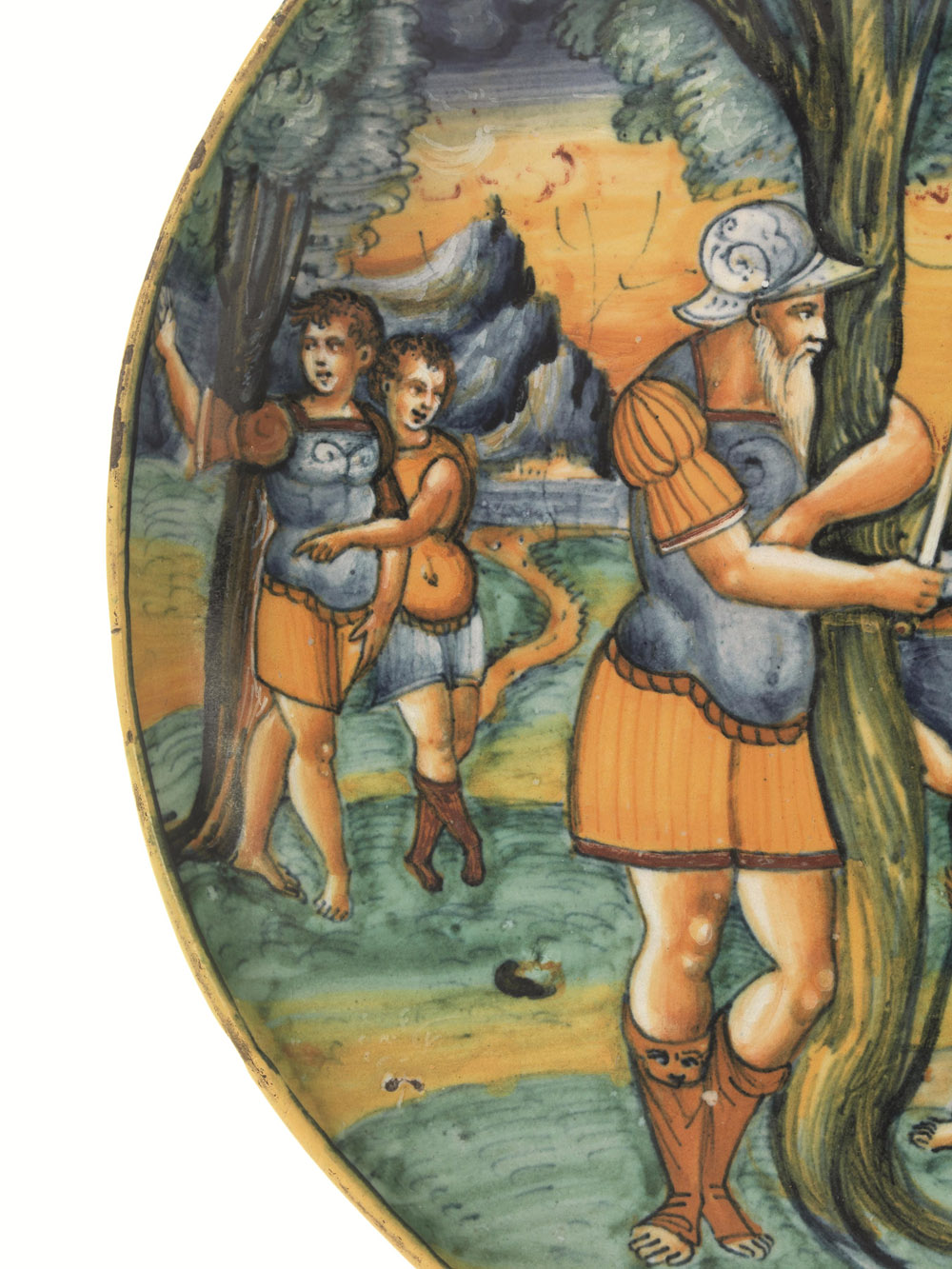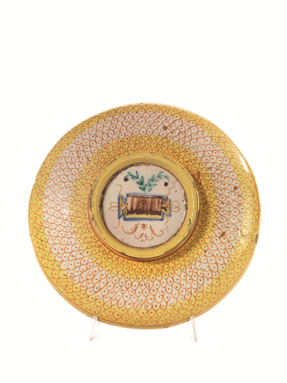 Earthenware, painted in orange, antimony yellow, green, blue, blackish and brownish manganese, and tin white