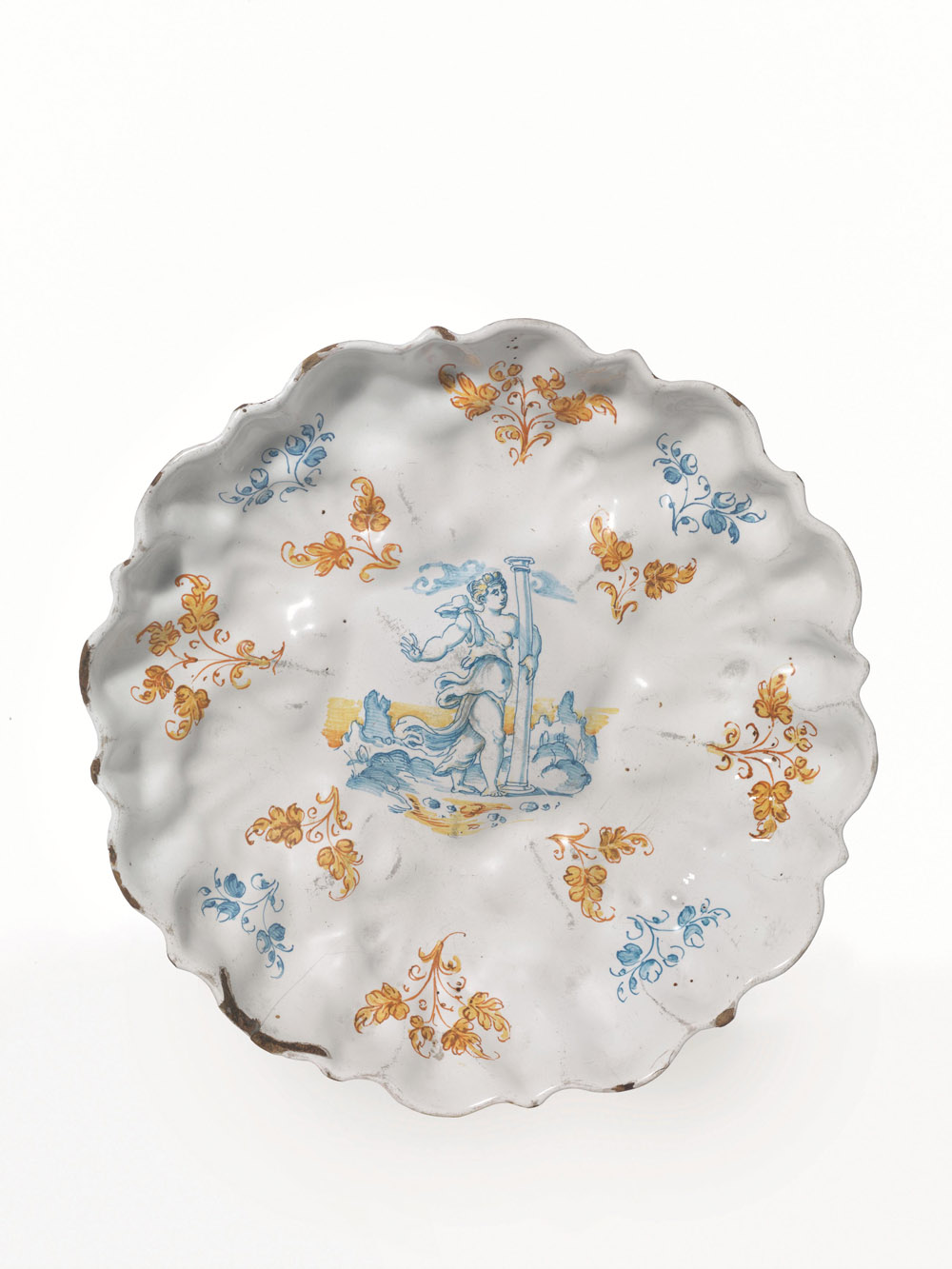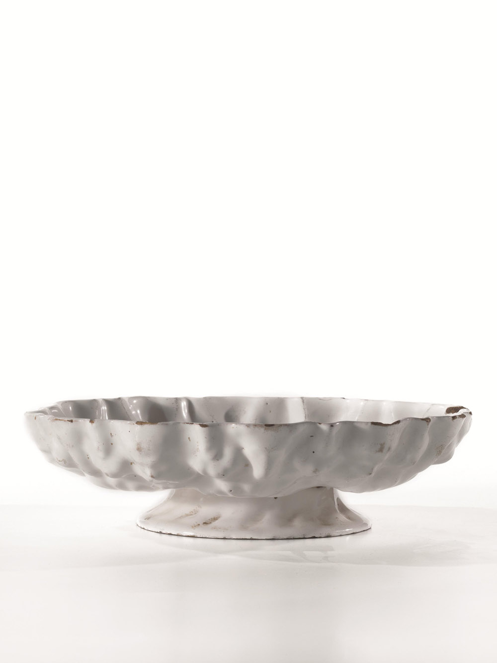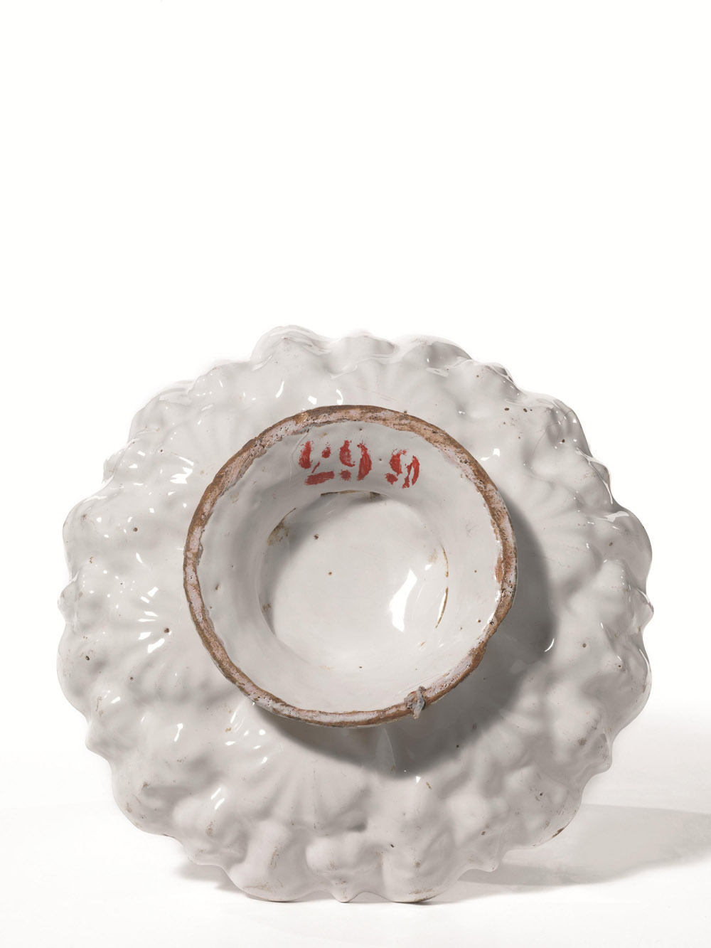 Coppa con umbone centrale rilevato, tesa baccellata a conchiglie e orlo sagomato. La coppa poggia su alto piede appena aggettante. La forma a “crespina” ricorda quella dell’esemplare precedente (lotto 31) da cui si distingue per la maggior leggibilità dello stampo attraverso lo smalto bianco spesso, ricco e lucente, che vede affiancati alle conchiglie dei bei mascheroni a rilievo distribuiti lungo l’orlo.