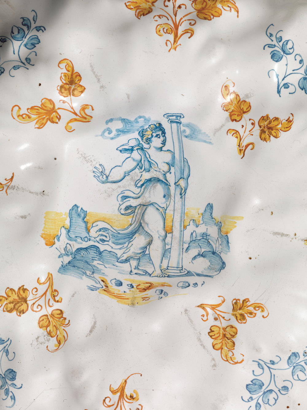L’opera mostra al centro dell’umbone una figura femminile che avanza sostenendo una colonna e sullo sfondo un paesaggio montano di grande impatto. La figura è attorniata da una decorazione a mazzi di foglie sparsi disordinatamente sulla tesa salvo alcuni ciuffi fogliati, di colore azzurro collocati in quattro punti simmetrici.