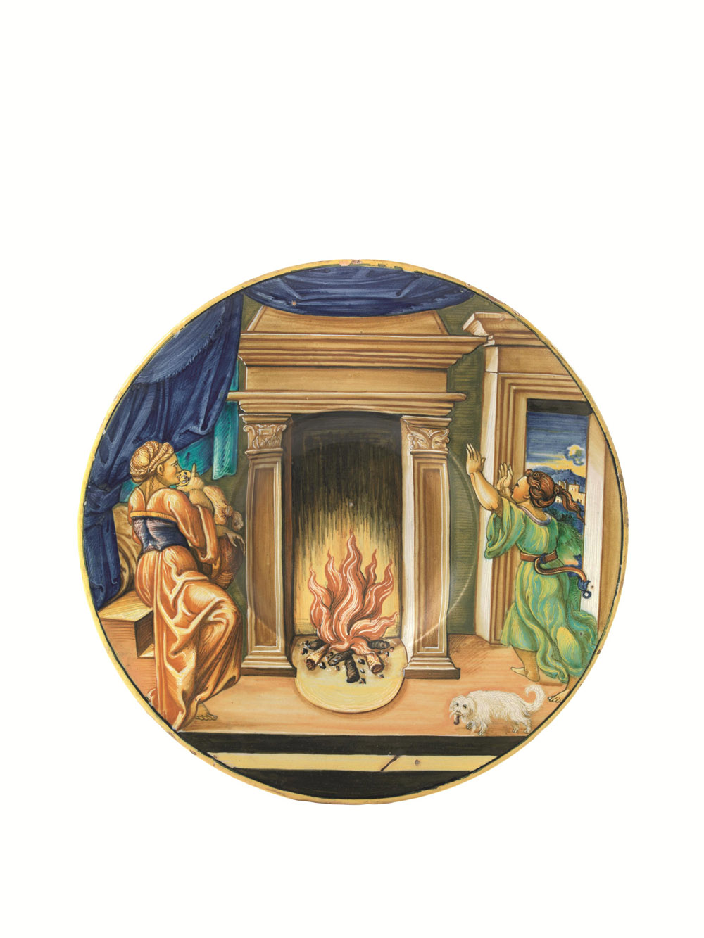 On the back, inscription ‘Vedi Porzia ch'il ferro el/fuoco affina. historia Y/ φ ’; on the back, collection round label hand-written in black ink ‘Xanto Avelli Urbino 1530’