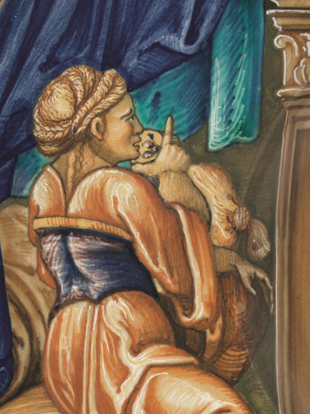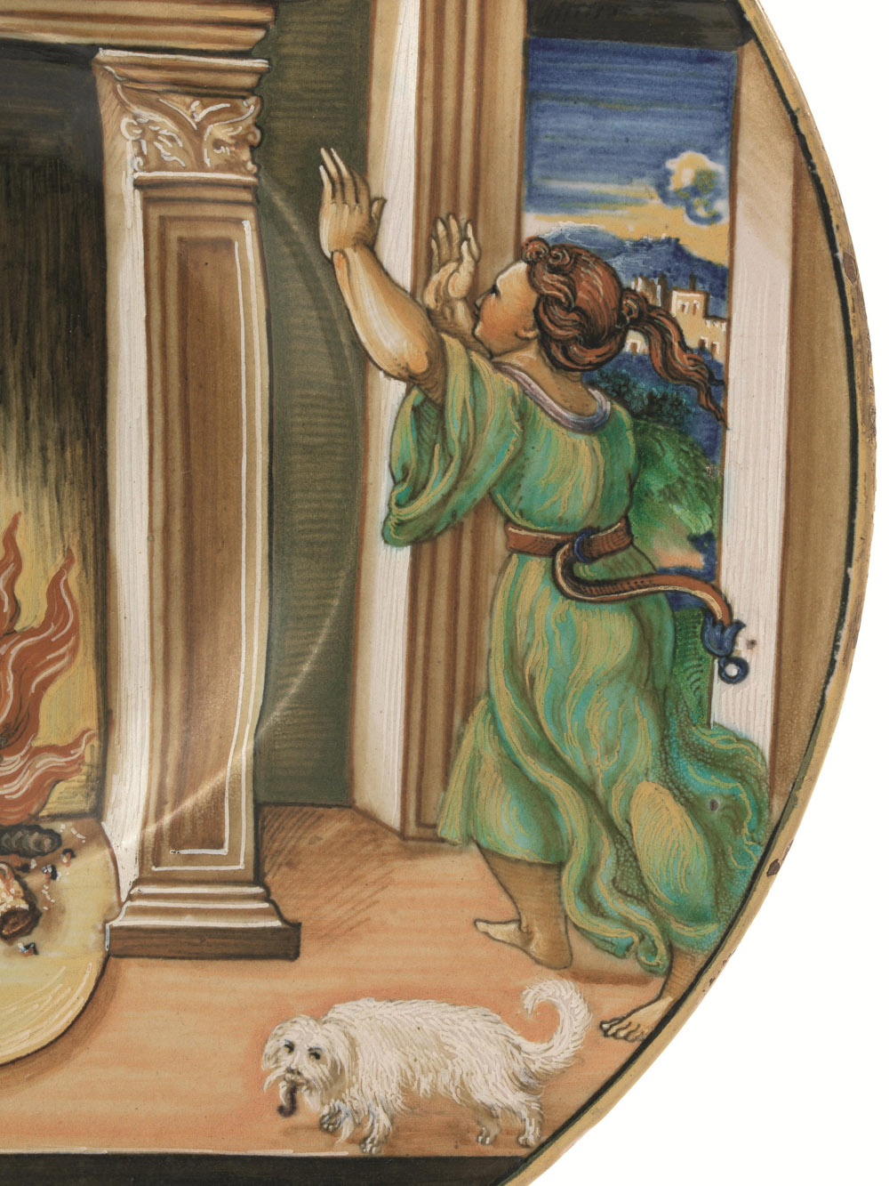 La giovane donna è dipinta sulla sinistra del piatto mentre, seduta su un gradino, inghiotte le braci; a destra un’ancella, sconvolta, cerca aiuto e in basso un cagnolino, con una piccola preda in bocca, guarda lo spettatore con fare smarrito; al centro il focolare, protagonista della composizione.