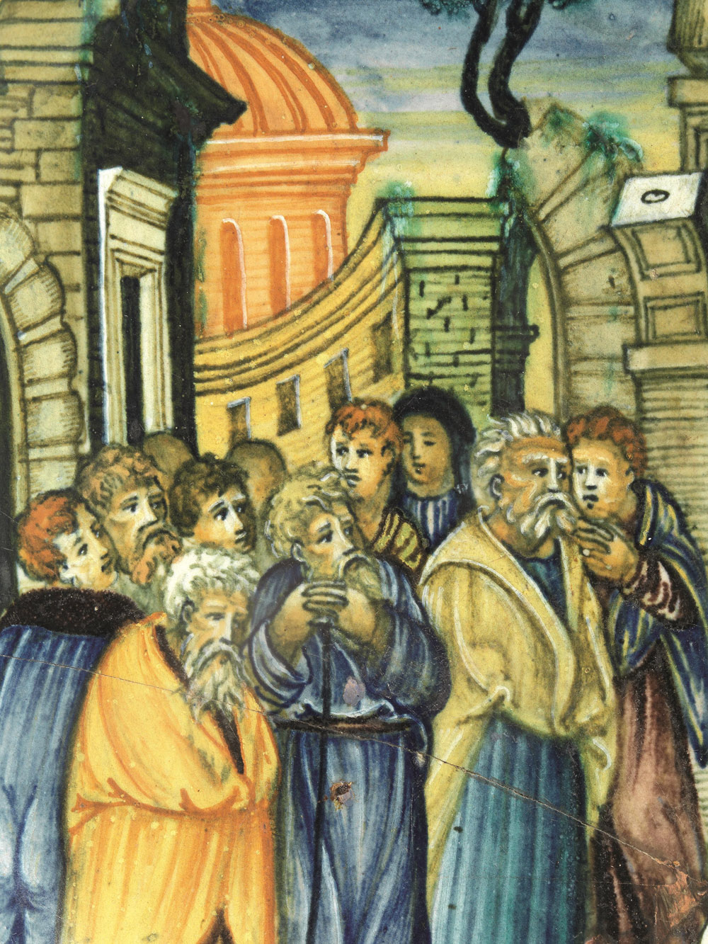 Questa vicenda riscontrò un grande successo nell’iconografia rinascimentale e in particolar modo sulla maiolica istoriata. Si vedano ad esempio i piatti del Museo di Pesaro che, con modalità stilistiche differenti, in alcuni casi accomunati dalle medesime incisioni di riferimento, raffigurano questa stessa scena (3); ma l’elenco di come questo episodio sia stato trattato in maiolica sarebbe assai lungo.