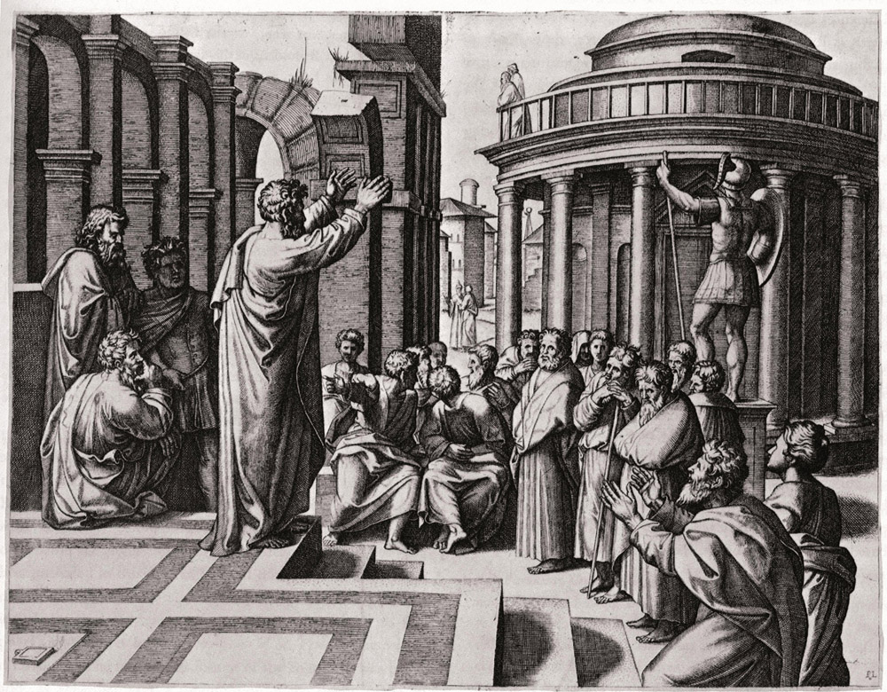 Notiamo nell’analisi della coppa che l’autore ha associato più incisioni nella formazione del soggetto da raffigurare: si riconosce nei personaggi assembrati ad assistere al sacrificio del giovane valoroso, una parte del popolo che affolla l’agorà nell’incisione di Marcantonio Raimondi che raffigura La predica di San Paolo nell'Areopago di Atene (4) (vedi fig. 1). La figura del Marco Curzio da Marcantonio Raimondi invece non ci pare possa costituire il riferimento iconografico corretto per l’opera in esame, pur essendo probabilmente assai nota nelle botteghe urbinati.