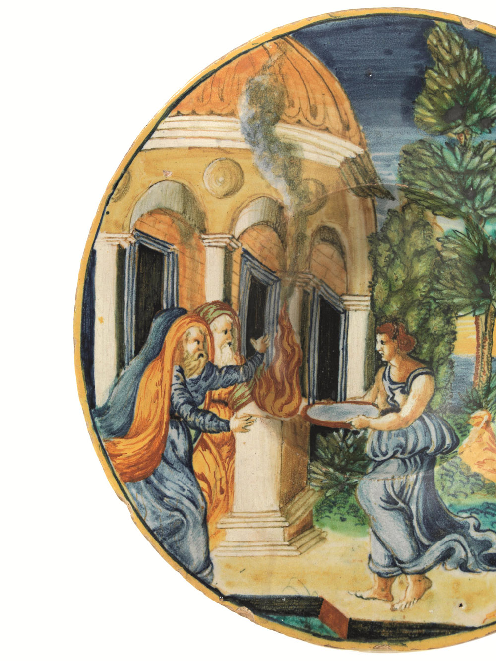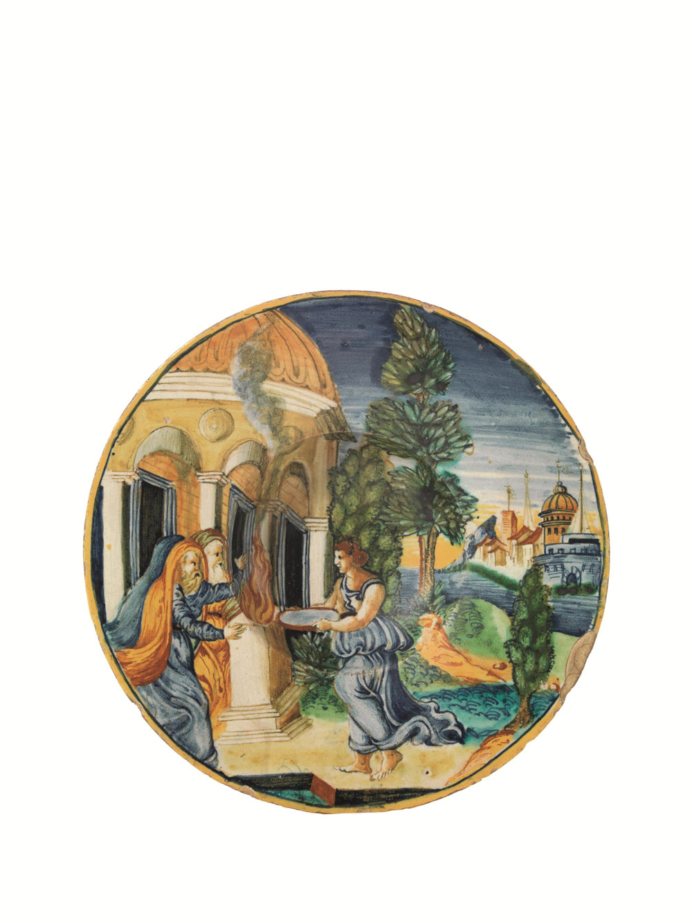 Ma è il confronto con un piatto del Museo Fitzwilliam di Cambridge (3) che ci fornisce una collocazione più precisa: si tratta di un piatto istoriato con La regina di Saba che ascolta il giudizio di Salomone , firmato “ nella Bottega di Maestro Guido Durantino ” e databile agli anni ‘30 del Cinquecento (4). Lo stile, un poco corrivo, a larghe pennellate, e la forma delle architetture, in particolare quella della gradinata, ci inducono ad avvicinare con buona sicurezza l’opera in esame a quella del museo inglese.