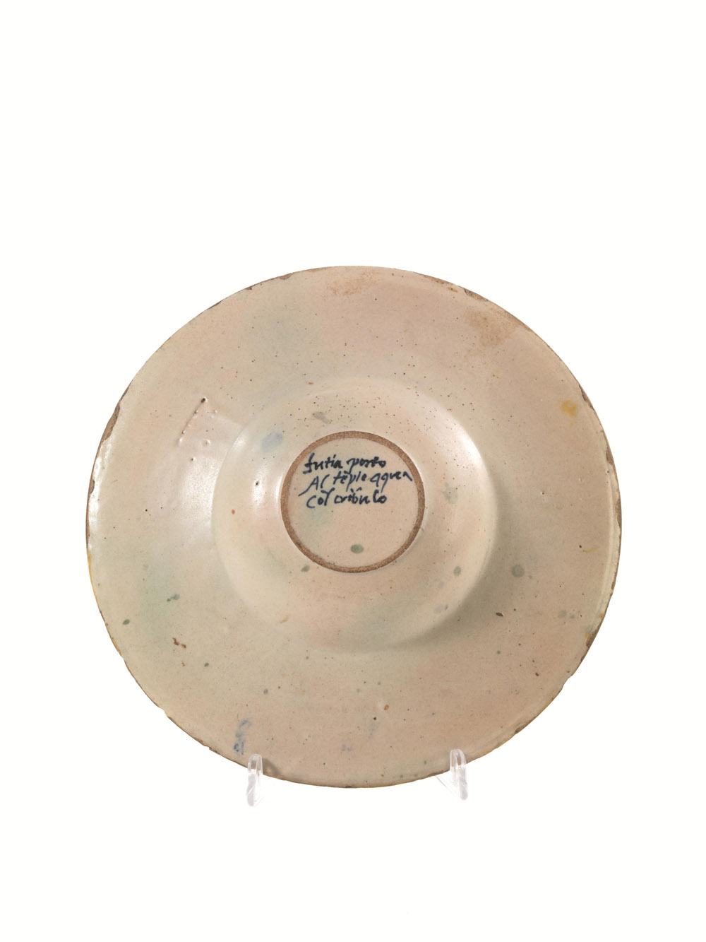 Sul retro al centro del cavetto in blu di cobalto è delineata la scritta “ Tutia porta/Al temple aqua col cribulo”.
