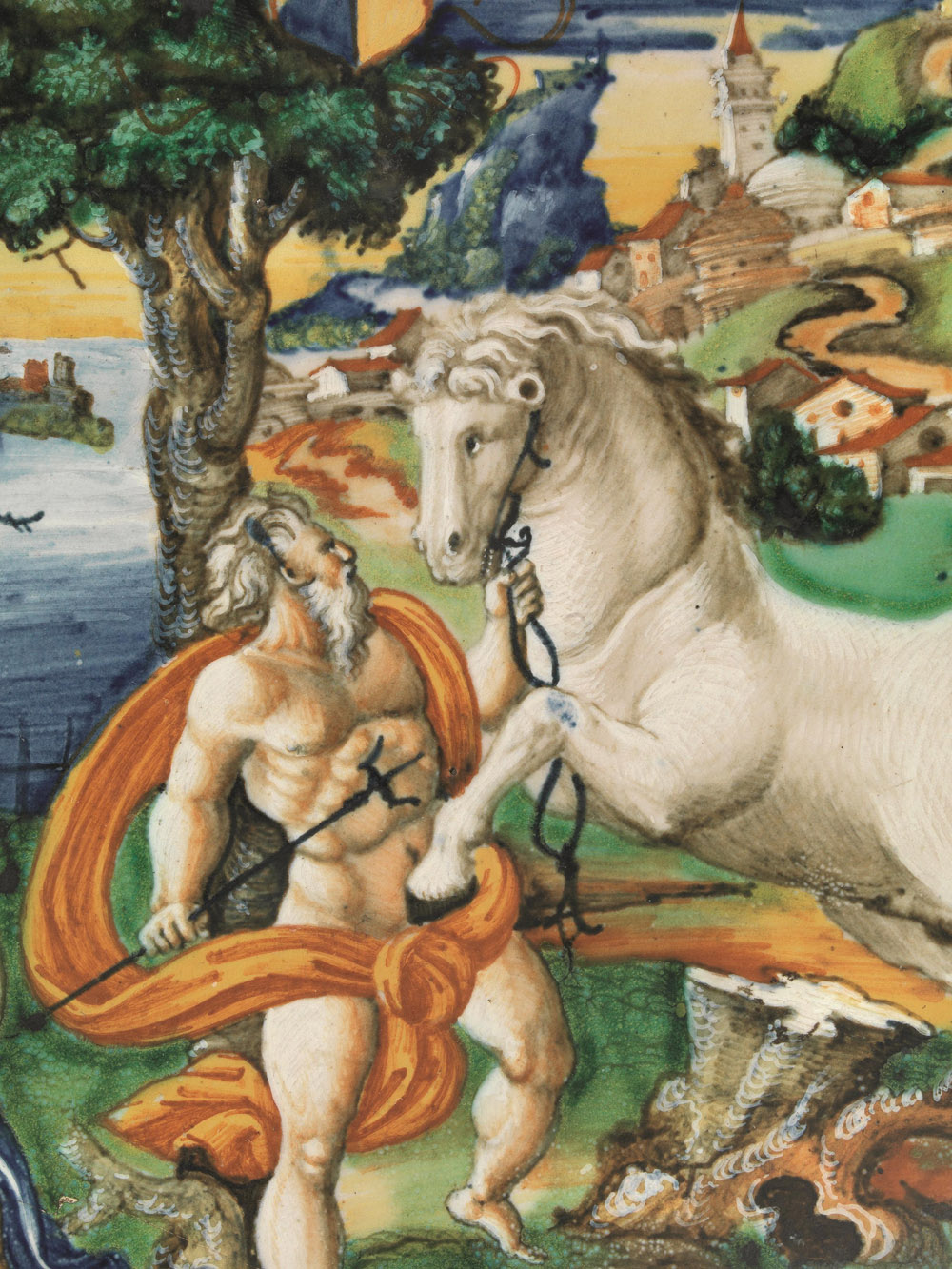 Il pittore sviluppa la scena su più livelli prospettici. In primo piano le due divinità al centro: Poseidone che con la destra regge il tridente e con la sinistra il cavallo (2), che s’impenna esprimendo tutta la sua potenza, e un poco in disparte, sulla sinistra, Atena entra nella scena avanzando a larghi passi e indicando alle sue spalle l’albero di ulivo. Sullo sfondo il porto di Atene e la città turrita che s’innalza su un colle. Su un albero è appeso uno stemma bipartito forse a indicare un matrimonio. Allo stato attuale degli studi non ci pare di poter riconoscere le famiglie nobiliari, anche se è forse possibile ipotizzare, per la sola metà a destra dello stemma, che si tratti della famiglia fiorentina dei Bardi (3).