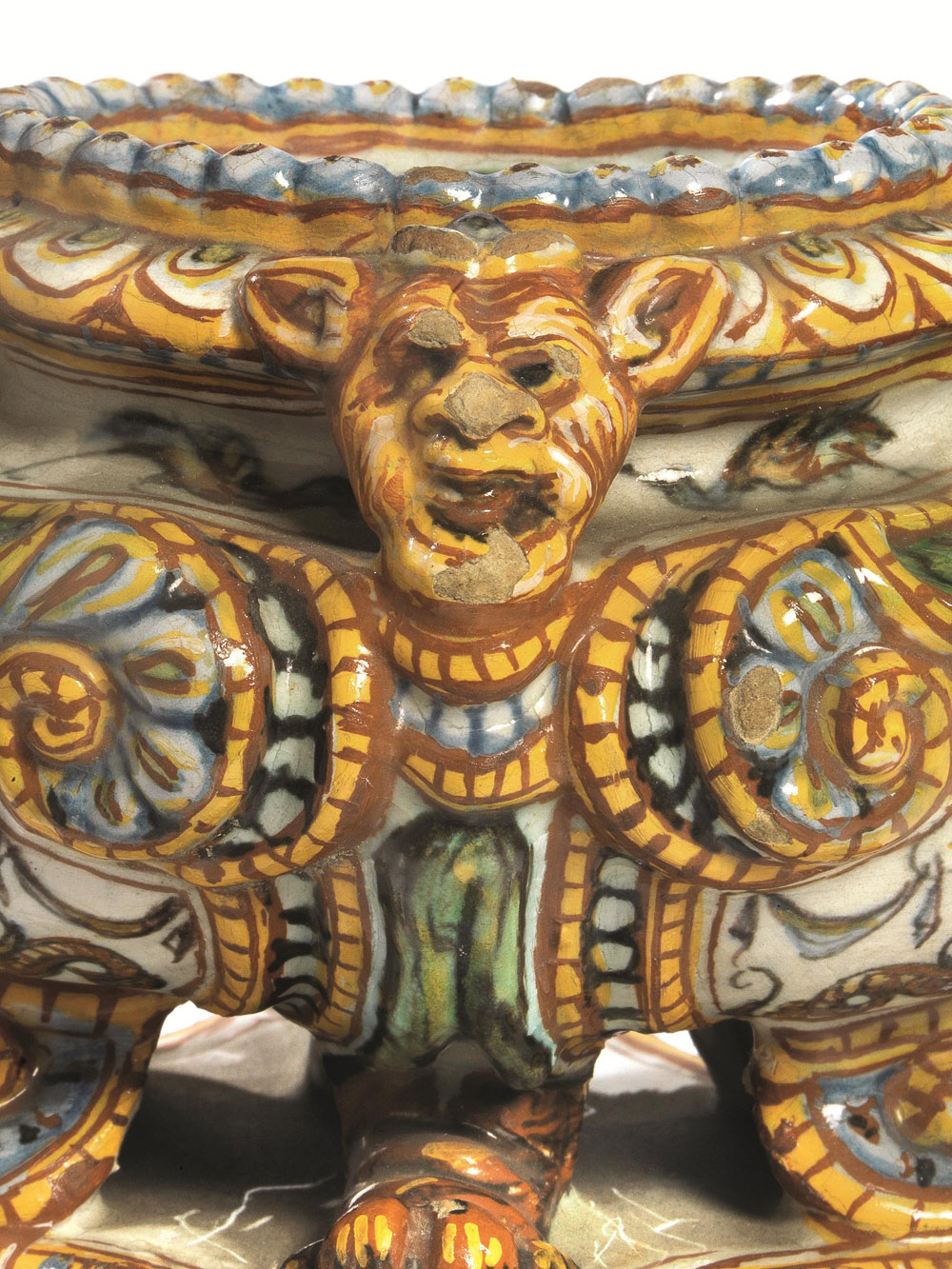 Molto vicina, per la presenza dello stesso modello plastico con minime varianti, è invece la saliera del Museo di Arti Decorative di Lione (4), che si distingue rispetto alla nostra per una scelta cromatica più sobria. Altri esempi sono presenti al Victoria and Albert Museum di Londra (5) e al Louvre (6): tutti appartengono a una produzione urbinate della fine del Cinquecento e sono attribuiti alla celebre bottega dei Patanazzi.