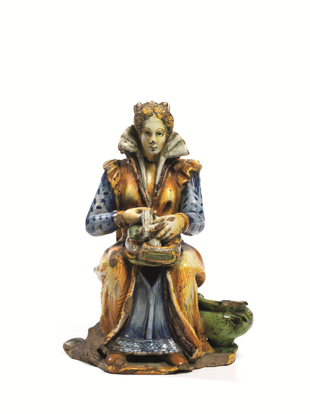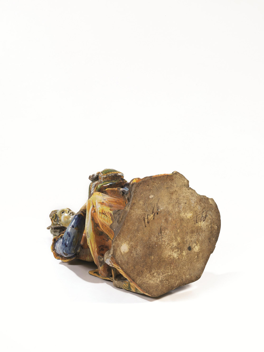 Il confronto con esemplari simili, anch’essi plasmati con personaggi di genere, ci conforta nell’attribuzione. Si vedano ad esempio “il suonatore di organo”, con tratti fisiognomici del volto molto vicini al nostro esemplare, raffigurato sul calamaio del Victoria and Albert Museum recante un cartiglio con la scritta “Urbino” (3); il “Bacco ubriaco” dello stesso museo che, in forma di fontana, riproduce lo stile e il gusto dei calamai urbinati (4); il calamaio con figura di “San Girolamo” del Museo di Leningrado con analoga datazione (5) e le belle plastiche presentate in una mostra sulle maioliche rinascimentali nello stato di Urbino di qualche anno fa (6), in particolare il “San Matteo” (7) della Cassa di Risparmio di Rimini, il “Mosè con le tavole della legge” e la “coppia di figurine” in cui compare un personaggio femminile.