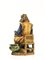 Il calamaio raffigura una dama intenta a verificare una lavorazione, forse un rotolo di pizzo: la donna è rappresentata seduta in abiti rinascimentali con una camiciola dall’ampio collo, aperta sul davanti, un soprabito smanicato, trattenuto in vita da una cinta sottile, che ricopre un abito azzurro dalle maniche lunghe (1). La donna ha i capelli raccolti sul capo e guarda di fronte, mentre con la mano destra scorre il pizzo che trattiene con la sinistra. Il rotolo è contenuto in un cestino che la donna, seduta su una seggiolina da camino, tiene sulle ginocchia. Ai piedi della sedia un vasetto verde per contenere l’inchiostro.