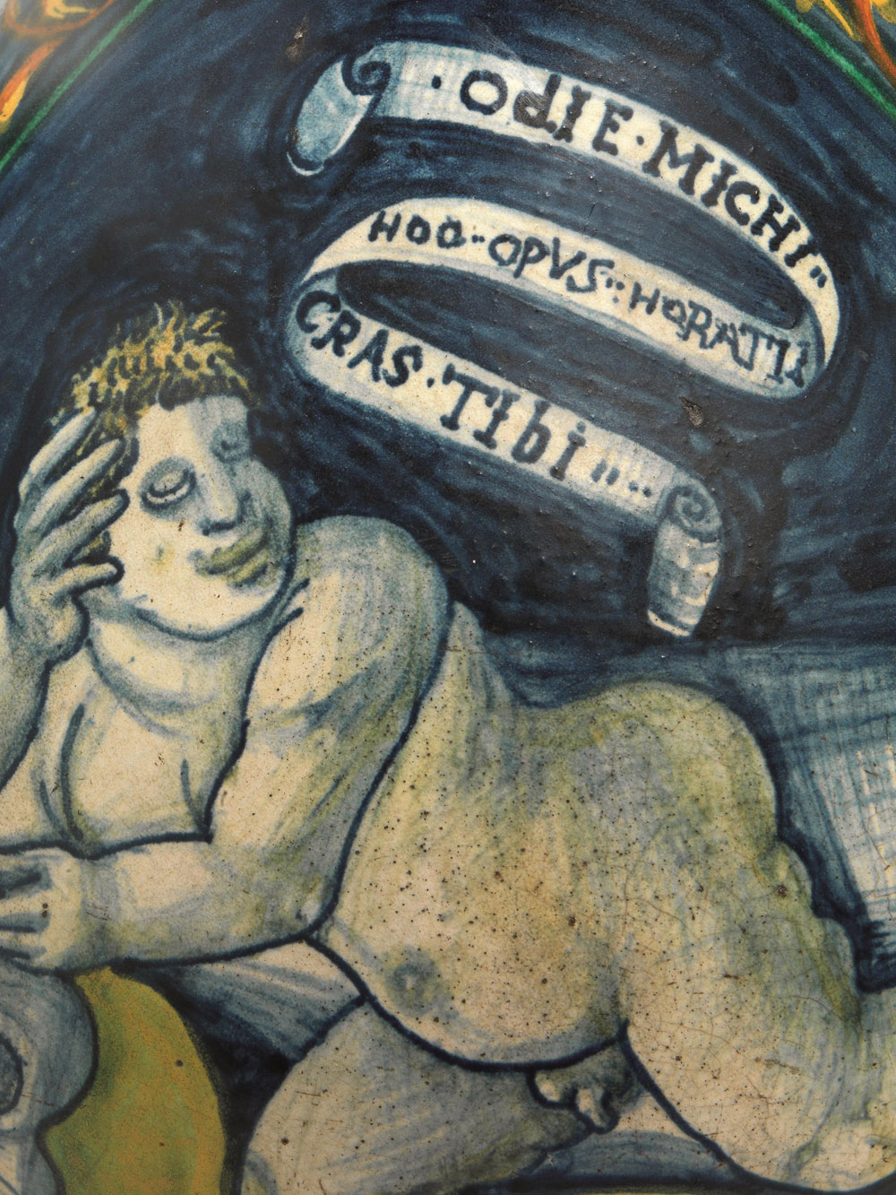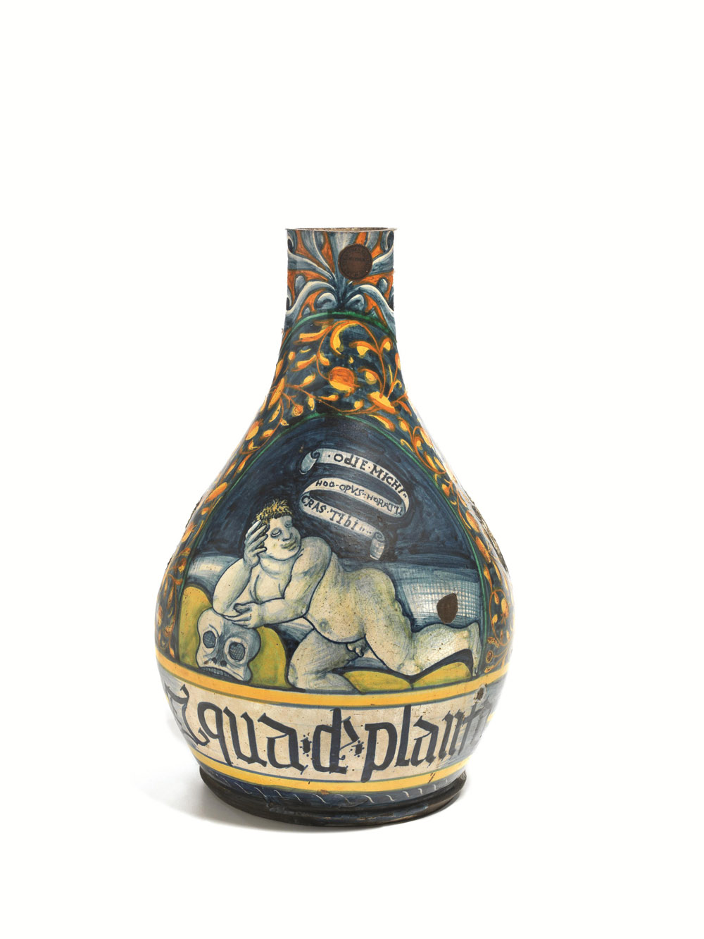 Il decoro con il putto disteso sul teschio si ritrova su un pilloliere di questo stesso corredo farmaceutico, databile alla metà del secolo XVI e oggi conservato al Museo Duca di Martina a Napoli. Si concorda pienamente con l’interpretazione che ne dà Luciana Arbace, proprio in relazione con la nostra fiasca, di un motivo di Memento mori, come d’altronde conferma il cartiglio descritto sopra.