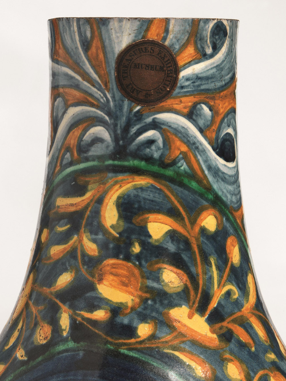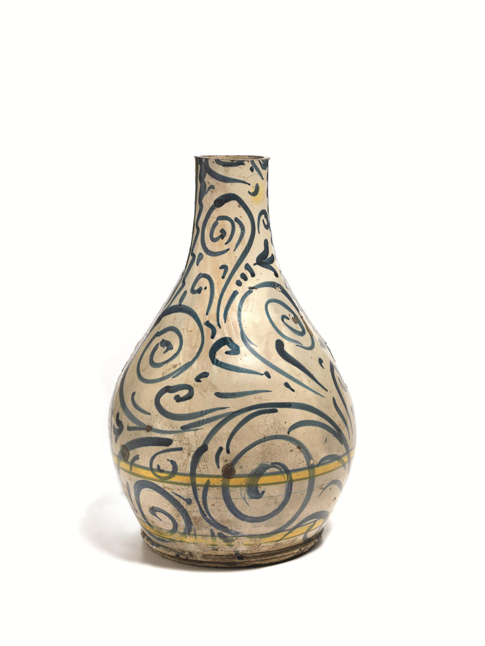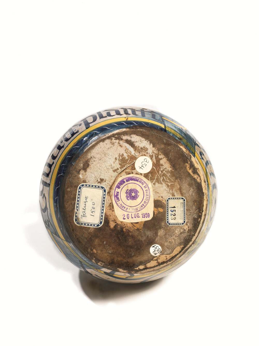 Beneath the base, stamp ‘1959’, stamp ‘1523’, printed label ‘GALL. BELLINI’, and label hand-written in ink ‘Faenza 1500’; on the neck, round label printed ‘ART TREASURES EXHIBITION MUSEUM’
