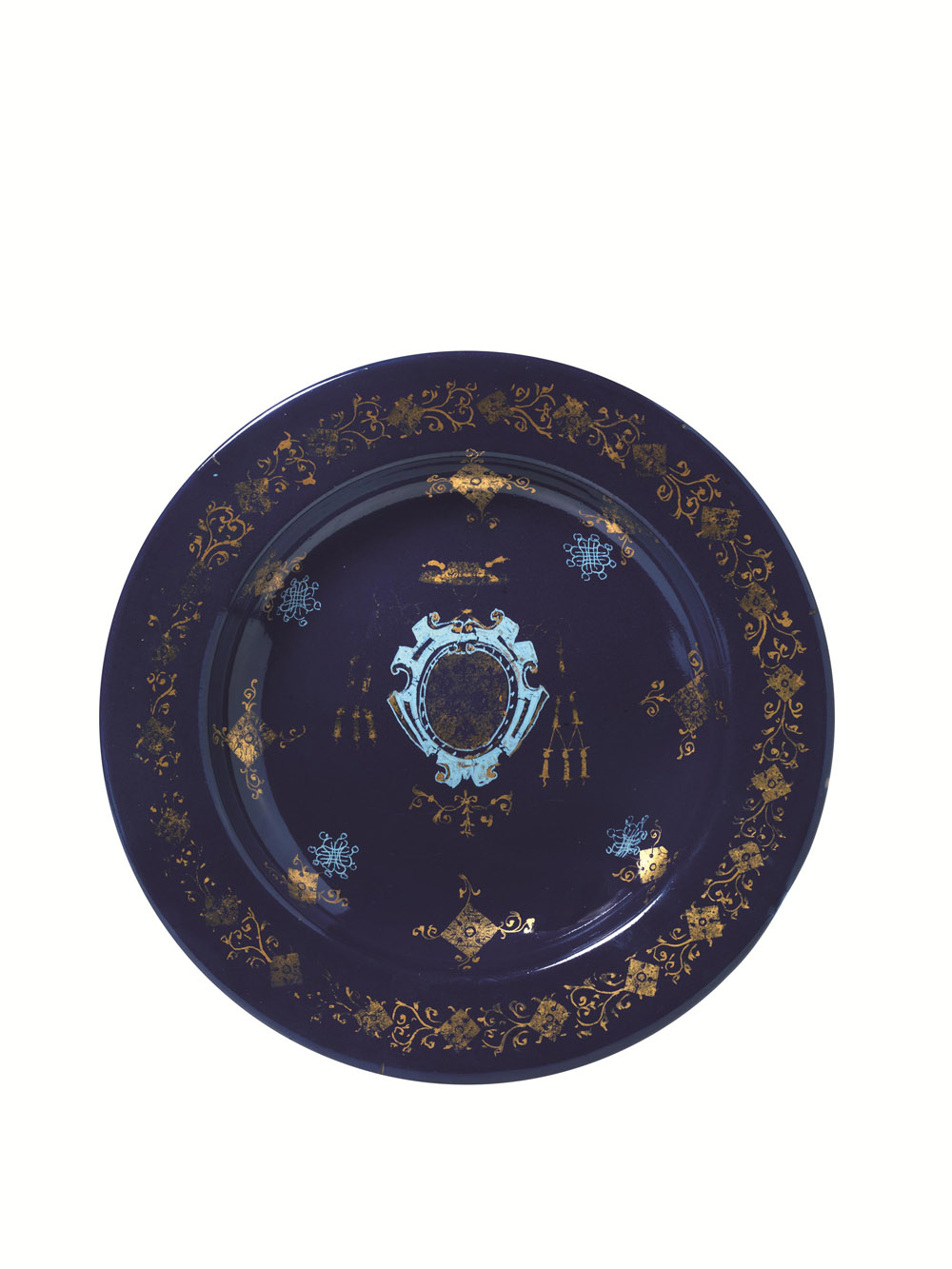 Earthenware, covered with a cobalt-blue glaze and painted in gold and tin white