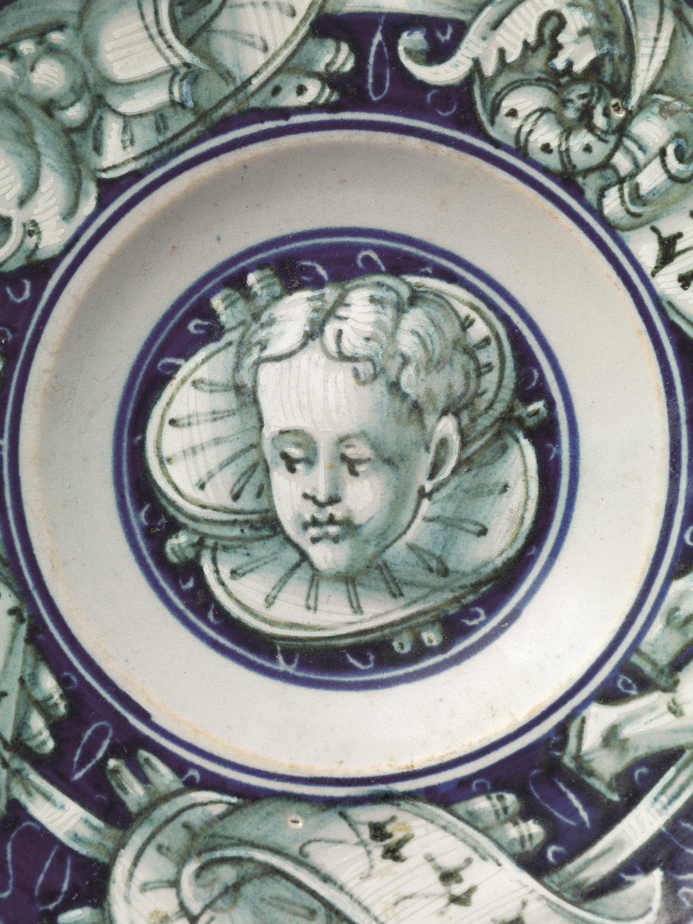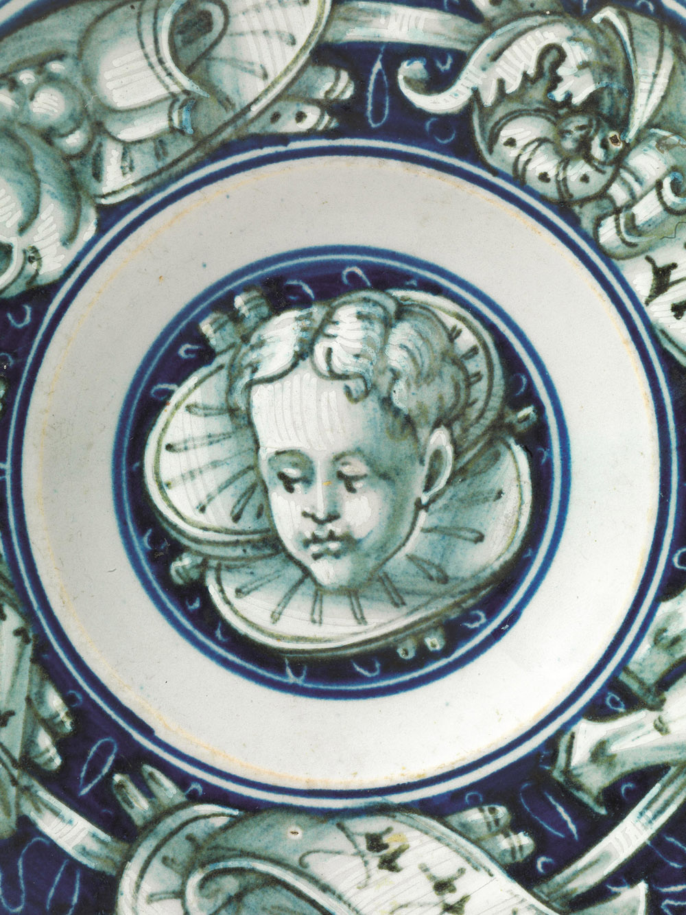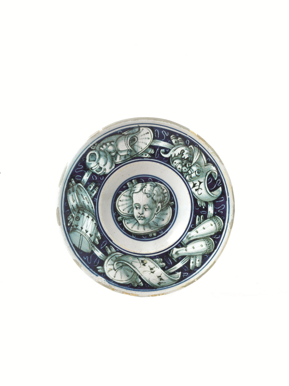 Un riscontro calzante si trova in un piatto con trofei con armi, strumenti musicali e geografici pubblicato da Timothy Wilson nel 1996 (4). Il piatto, allora attribuito alla bottega di Maestro Ludovico, è datato 1537 e mostra caratteristiche stilistiche e tecniche sovrapponibili all’opera in esame: il volto al centro del piatto e lo stesso stile del decoro coincidono in modo particolare con il nostro esemplare.