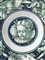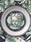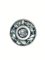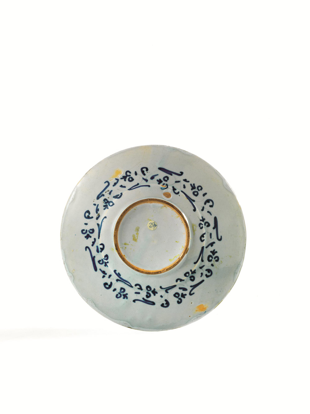Il retro del piatto mostra un motivo decorativo “alla porcellana” realizzato a punta di pennello in blu, che corre tra la tesa e il cavetto attorno al basso anello di appoggio, su fondo di smalto appena azzurrato.