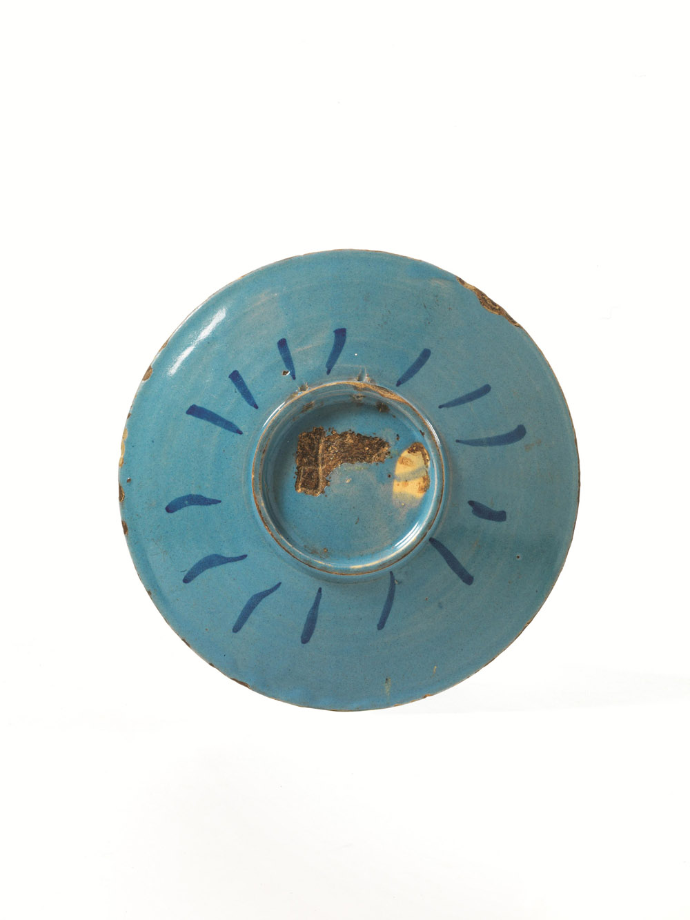 Il verso del piatto mostra una decorazione a pennellate radiali attorno al piede, invece del più comune motivo cosiddetto “a cestello”.