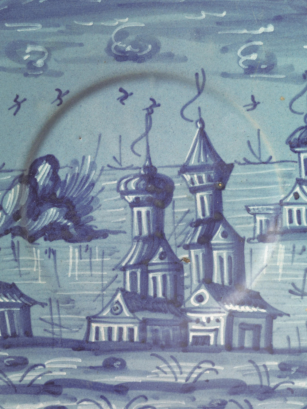 I pezzi dei servizi mostrano decori simili a quello esposto sul piatto in studio, ma con modalità morfologiche, pittoriche e stilistiche differenti: lo studio di Saccardo , Camuffo e Goffo ci suggerisce alcuni esemplari di confronto (2); una scodella con decoro simile, ma con caratteristiche pittoriche meno calligrafiche, è conservata nella Raccolte di Arti Applicate del Castello Sforzesco di Milano (3). Il nostro piatto si distingue però dalla maggior parte degli esemplari in studio per la presenza di un paesaggio lagunare, raro e solitamente sostituito da dettagli di gusto rovinistico (4). Senza voler paragonare il livello eccezionale raggiunto dalle architetture raffigurate sul grande piatto del Museo dell’Ermitage (5), riteniamo che la presenza di architetture all’orientale e lo stile molto curato nell’esecuzione giustifichino l’inserimento del nostro piatto in una fase produttiva abbastanza precoce e pertanto nell’ultimo quarto del secolo.
