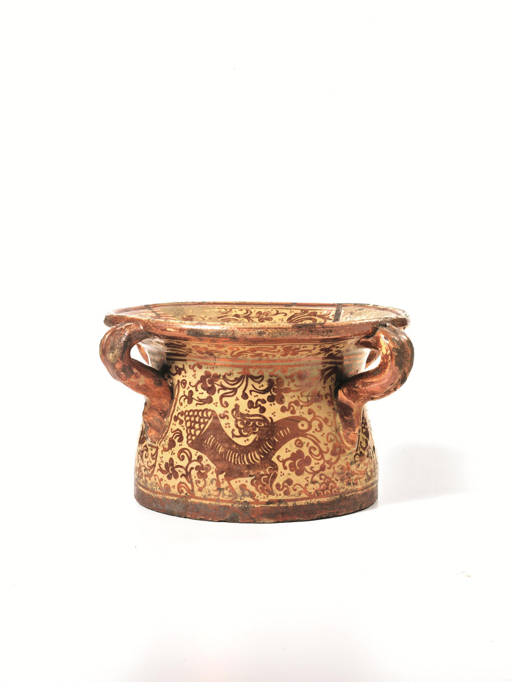 Il rivestimento, in smalto stannifero color avorio, è ricoperto da una decorazione a lustro di colore rosso ramato che interessa l’intera superficie del vaso, anche nella parte interna. Il decoro è meno curato all’interno del contenitore, con un motivo a larghe foglie e spirali, e con puntinature a riempire i campi vuoti. Sulla tesa corre un motivo a piccoli fioretti quadripetali con lunghi pistilli e gambo fogliato dall’andamento mosso. Sul corpo, sui due lati principali, si scorge il tipico decoro a pardalot , circondato da fioretti sinuosi e puntinature. La base è anch’essa decorata con un motivo naturalistico dipinto con maggior rapidità. Il decoro deriva dal prototipo dei pardalot, da rintracciare quasi certamente nel tipo dell'aquila raffigurata sul rovescio di piatti valenciani della prima metà del IX-X secolo. Una stilizzazione di questo genere, evolvendosi nel tempo, diviene di uso comune sui prodotti valenciani fra il XII e il XVIII secolo.