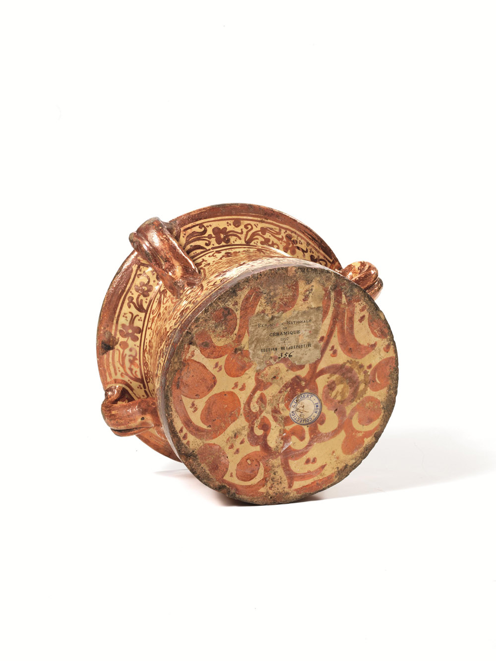 Beneath the base, rectangular printed label ‘EXPOSITION NATIONALE/ DE CÉRAMIQUE/ 1897/ SECTION RETROSPECTIVE’, with ‘356’ hand-written; round printed label ‘COLLECTION IMBERT ROME’ (in the centre, hardly readable hand-written number).