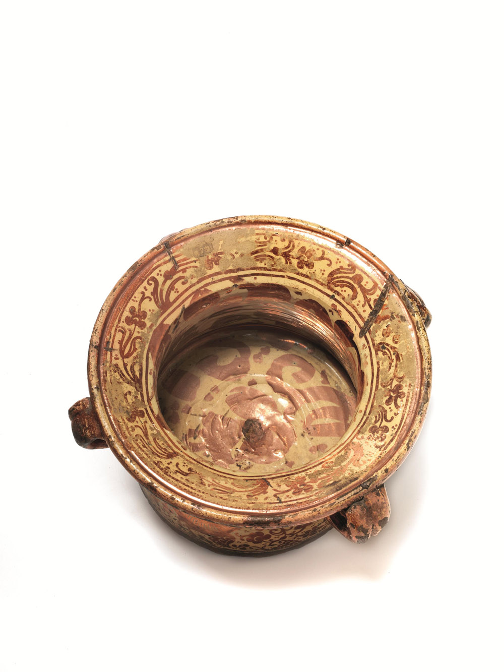 Le decorazioni della parte interna del vaso e della base sono campite a lustro secondo modalità già tarde della produzione ispano-moresca. Invece, i due tipici uccelli dipinti sul fondo puntinato del corpo presentano tratti stilistici ancora antichi e non la tipica stilizzazione a fasci di linee secondo l’evoluzione del decoro. Per queste caratteristiche, ci pare di poter ascrivere l’opera ancora a una fase precoce o comunque di transizione.