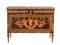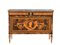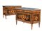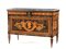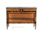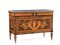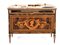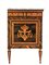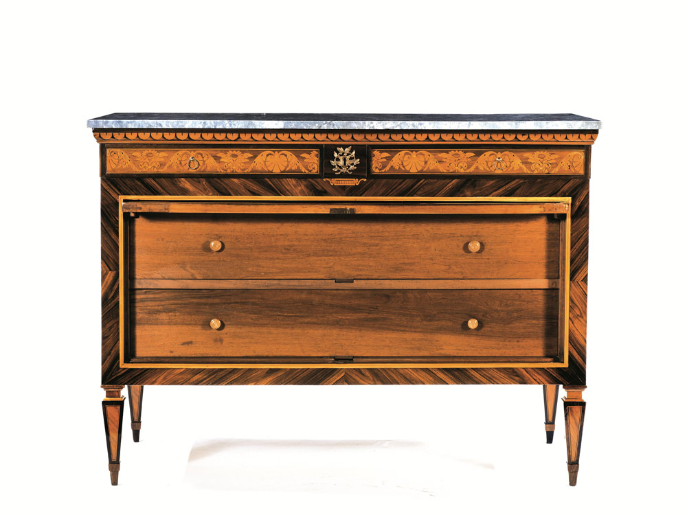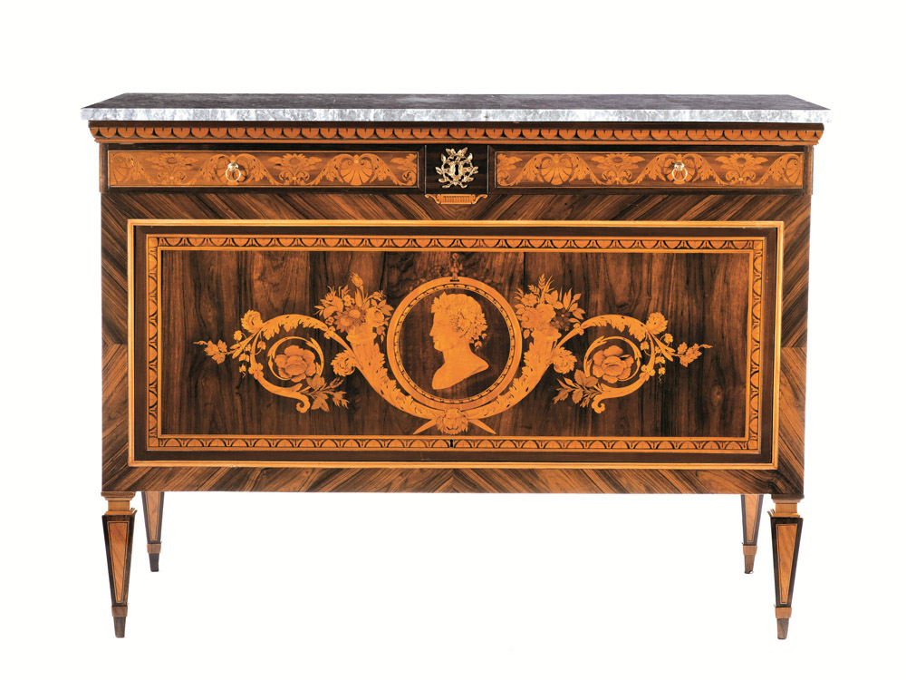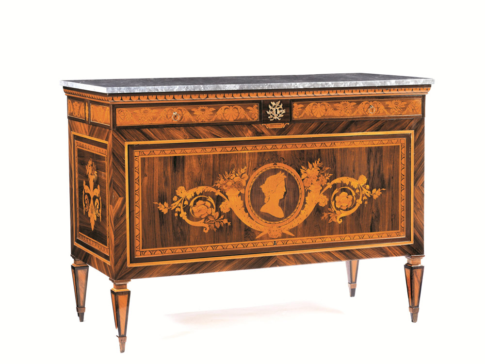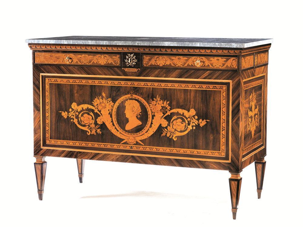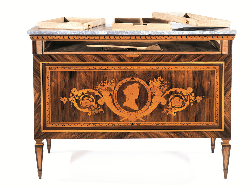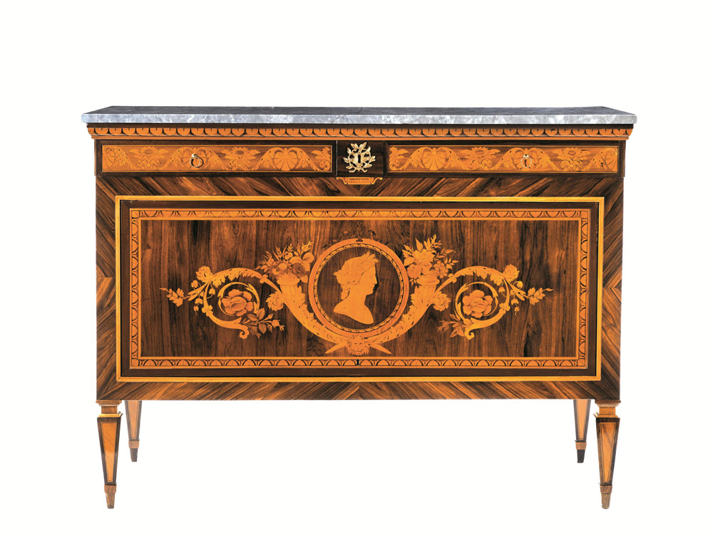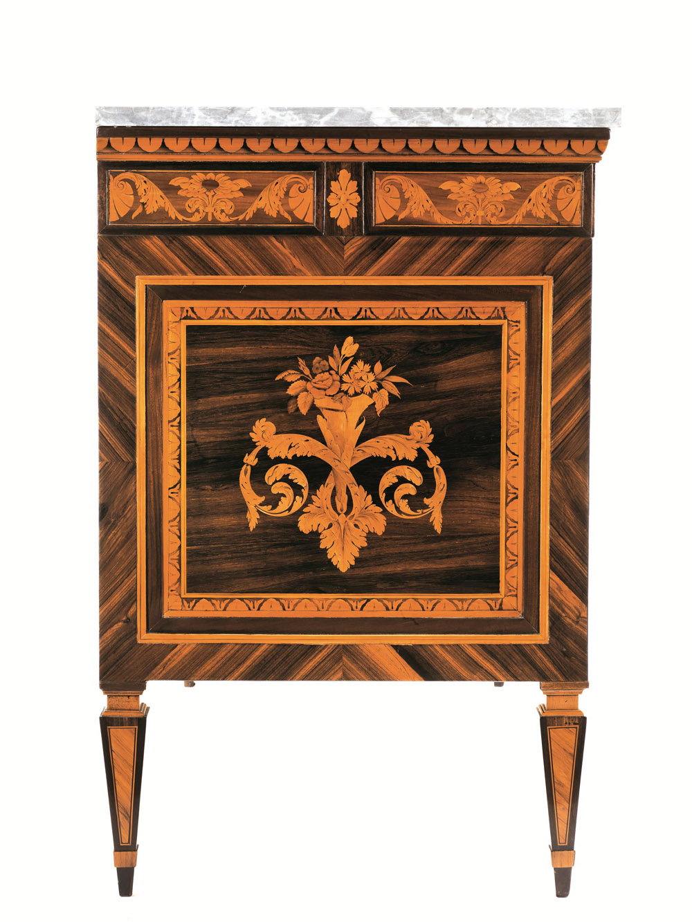 Coppia di cassettoni neoclassici in legno impiallacciato e intarsiato, il fronte con pannello scorrevole a scomparsa celante due cassetti e un cassetto sottile sotto il piano in marmo grigio; nella fascia un meccanismo a molla che nasconde cassetti segreti; il pannello centrale decorato con busti di profilo raffiguranti Bacco e Cerere entro medaglione circolare affiancato da cornucopie terminanti in girali floreali, i fianchi con fiaccola fiorita sorretta da volute vegetali, la serratura con applicazione in bronzo dorato traforato a foglie; gambe piramidali.