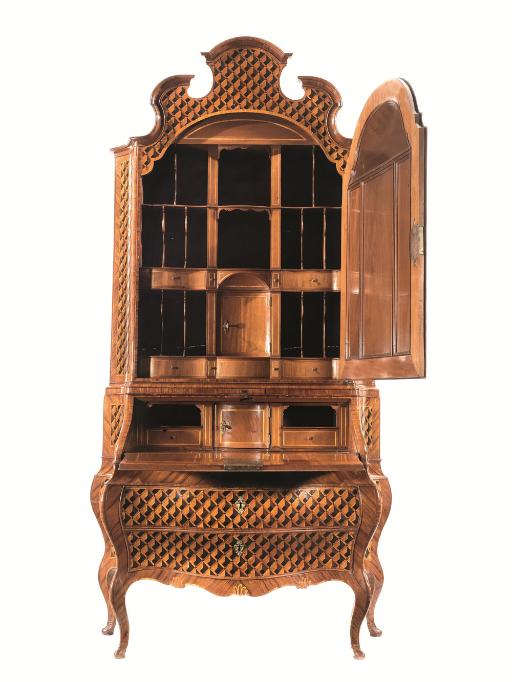 Non sfugge a questa logica costruttiva di curve e controcurve neppure la calatoia che si apre su una base a due cassetti, scoprendo uno scarabattolo con due cassettini e altrettanti vani centrati da uno piccolo sportello, anch’essi mossi.